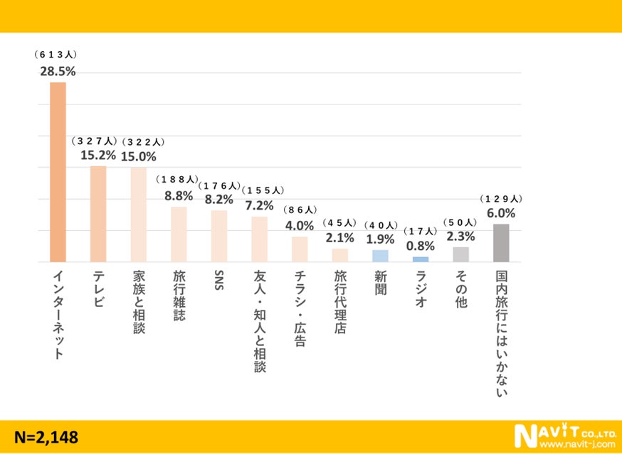 旅行先を決めるときの情報源を問うアンケートです。「インターネット」と回答した方は28.5%、「テレビ」と回答した方は15.2%、僅差で「家族と相談」と回答した方が15.0%という結果になりました。