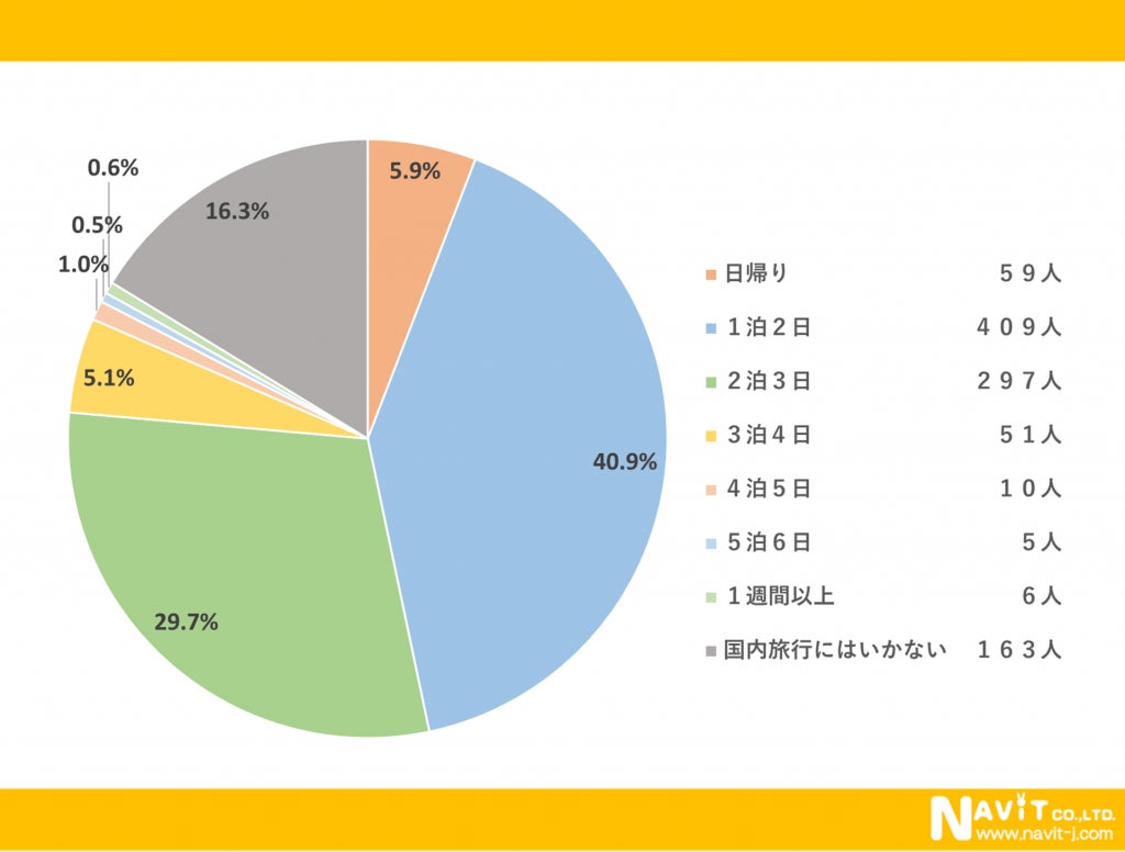 平均何泊の予定で旅行をするかを問う質問では、「1泊2日」が最も多く40.9%、二番目に「2泊3日」で29.7%となりました。