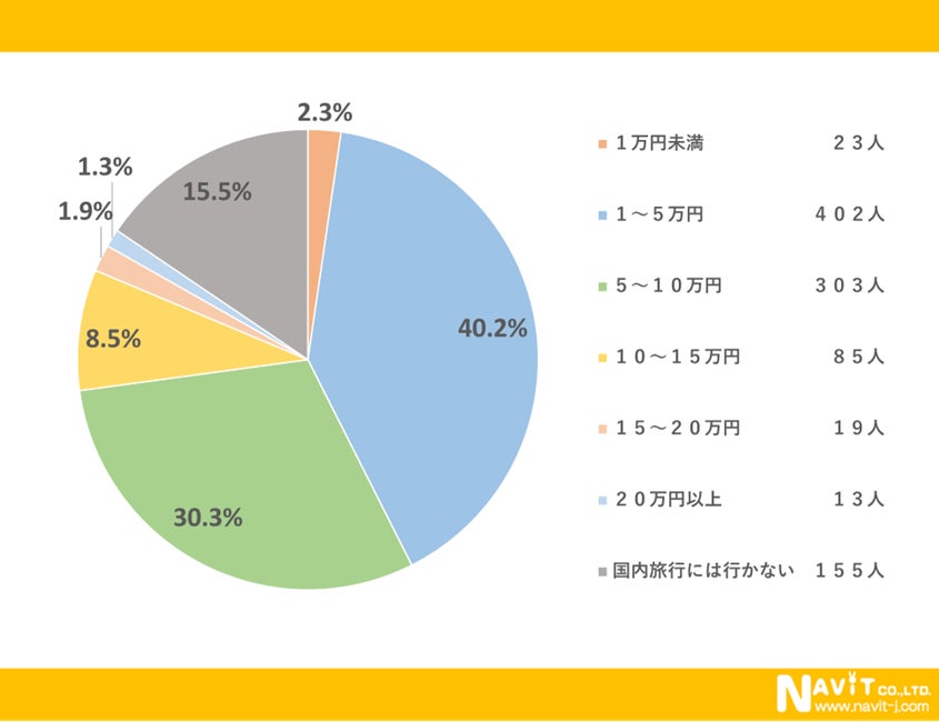 国内旅行の予算を問う質問では、「1~5万円」と回答した方が40.2%と最も多く、「5~10万」と回答した方が30.3%で二番目に多い結果となりました。