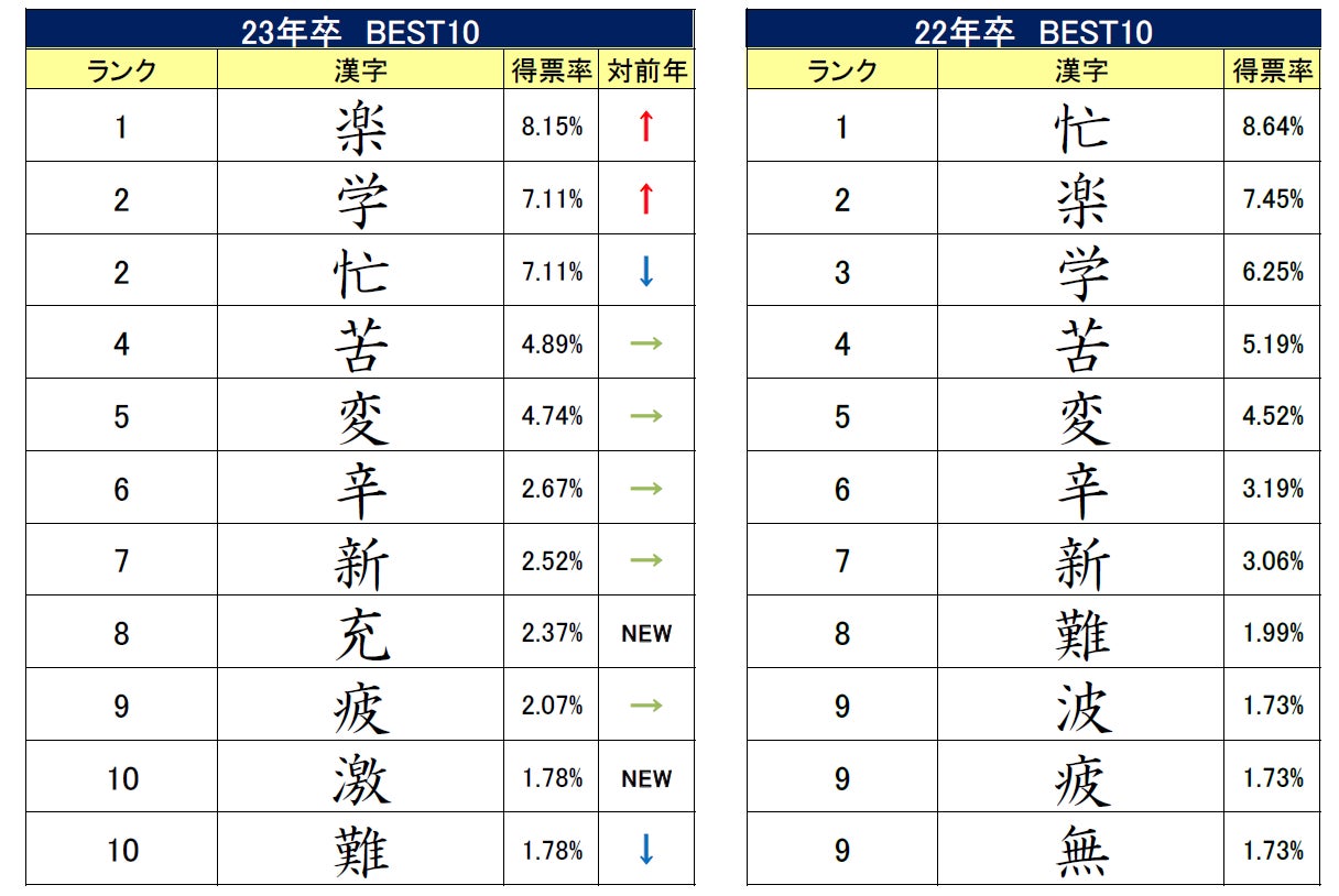 2023年卒の新社会人の生活を漢字一文字で表すと「楽」が最多。「充」「激」が新たにトップ10にランクイン【図1】
