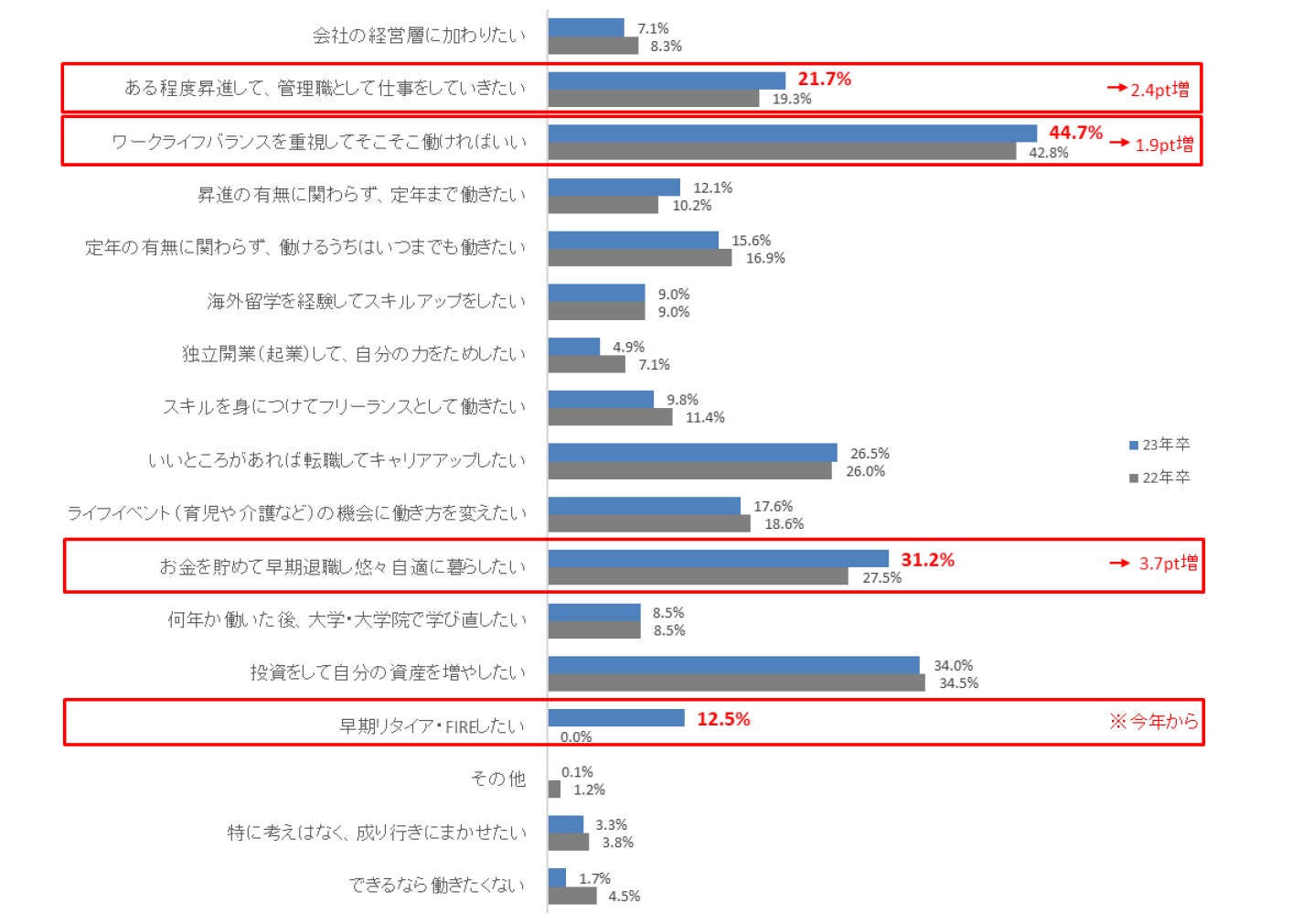 人生100年時代に向けた今後の働き方として、「ワークライフバランスを重視してそこそこ働ければいい」と回答した新社会人は前年比1.9pt増の44.7%で最多。「ある程度昇進して、管理職として仕事をしていきたい」は前年比2.4pt増の21.7%だった。また、「お金を貯めて早期退職し悠々自適に暮らしたい」が前年比3.7pt増の31.2%、「早期リタイア・FIRE※1したい」が12.5%(新設設問のため前年比なし)と、「定年まで働く」以外の価値観をもつ社会人が一定数いることがわかる【図4】