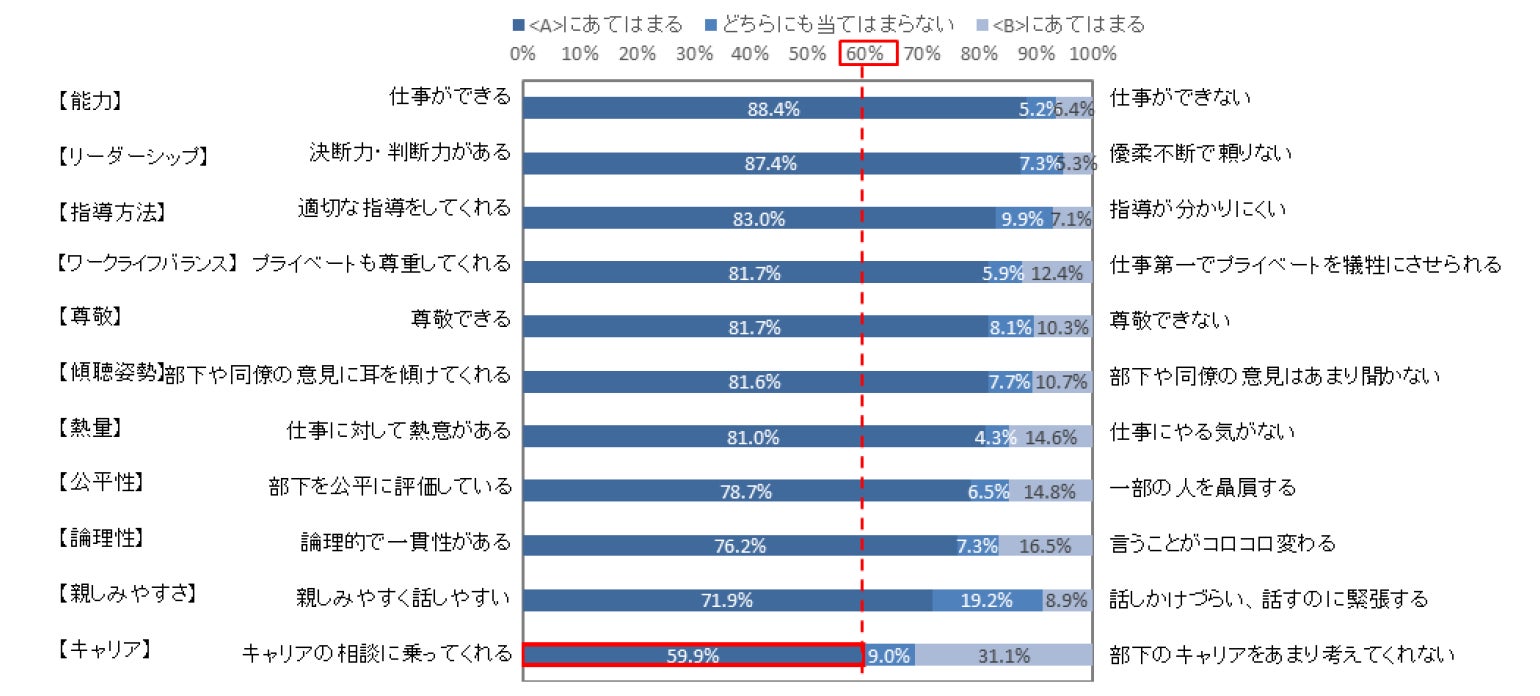現在の配属先での上司についてどのように感じているかを聞くと、「良い上司だ」が69.7%だった※2。現在の上司にあてはまるものを聞くと、「仕事ができる」(88.4%)、「決断力・判断力がある」(87.4%)、「適切な指導をしてくれる」(83.0%)などの点を評価しているようだ。最も低かったのは、「キャリアの相談に乗ってくれる」(59.9%)で、唯一7割を下回る結果となった。【図5、6】
