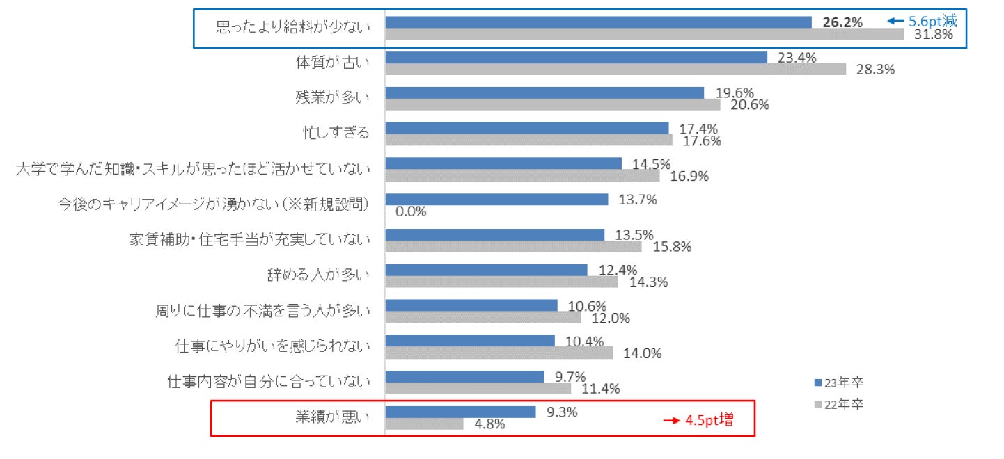 「現在の勤務先で働いてみて思ったこと」として、入社を決めた時とのネガティブなギャップを聞いた。「思ったより給料が少ない」が26.2%で昨年比5.6pt減と特に減少しており、初任給の引き上げを行った企業が多かったと推測される。一方、「業績が悪い」は前年比4.5pt増の9.3%だった。23年度上半期は物価高や円高、人件費の高騰や不安定化した国際情勢などの影響を受けた企業もあり、新入社員もその影響を感じとっているようだ。【図7】