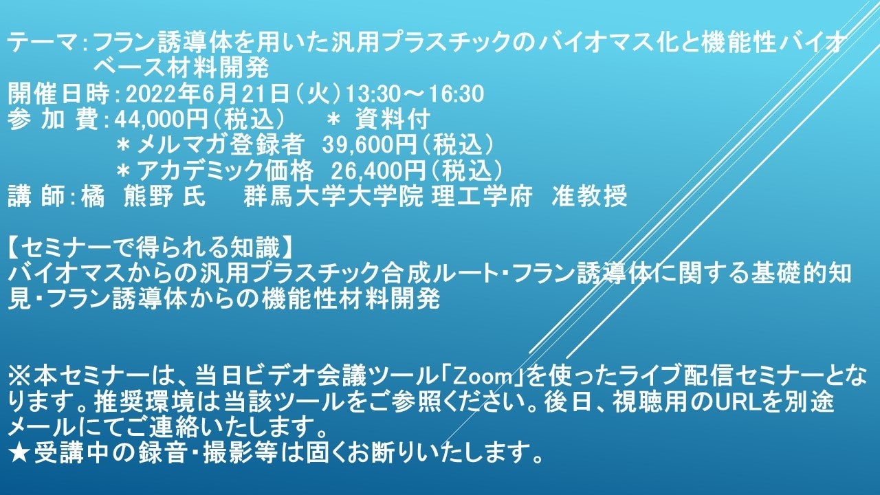 先端技術情報や市場情報を提供している(株)シーエムシー・リサーチ(千代田区神田錦町: https://cmcre.com/ )では、 各種材料・化学品などの市場動向・技術動向のセミナーや書籍発行を行っておりますが、 このたび「フラン誘導体を用いた汎用プラスチックのバイオマス化と機能性バイオベース材料開発」と題するセミナーを、 講師に橘 熊野 氏 群馬大学大学院 理工学府 准教授)をお迎えし、2022年6月21日(火)13:30より、 ZOOMを利用したライブ配信で開催いたします。 受講料は、 一般:44,000円(税込)、 弊社メルマガ会員:39,600円(税込)、 アカデミック価格は26,400円(税込)となっております(資料付)。