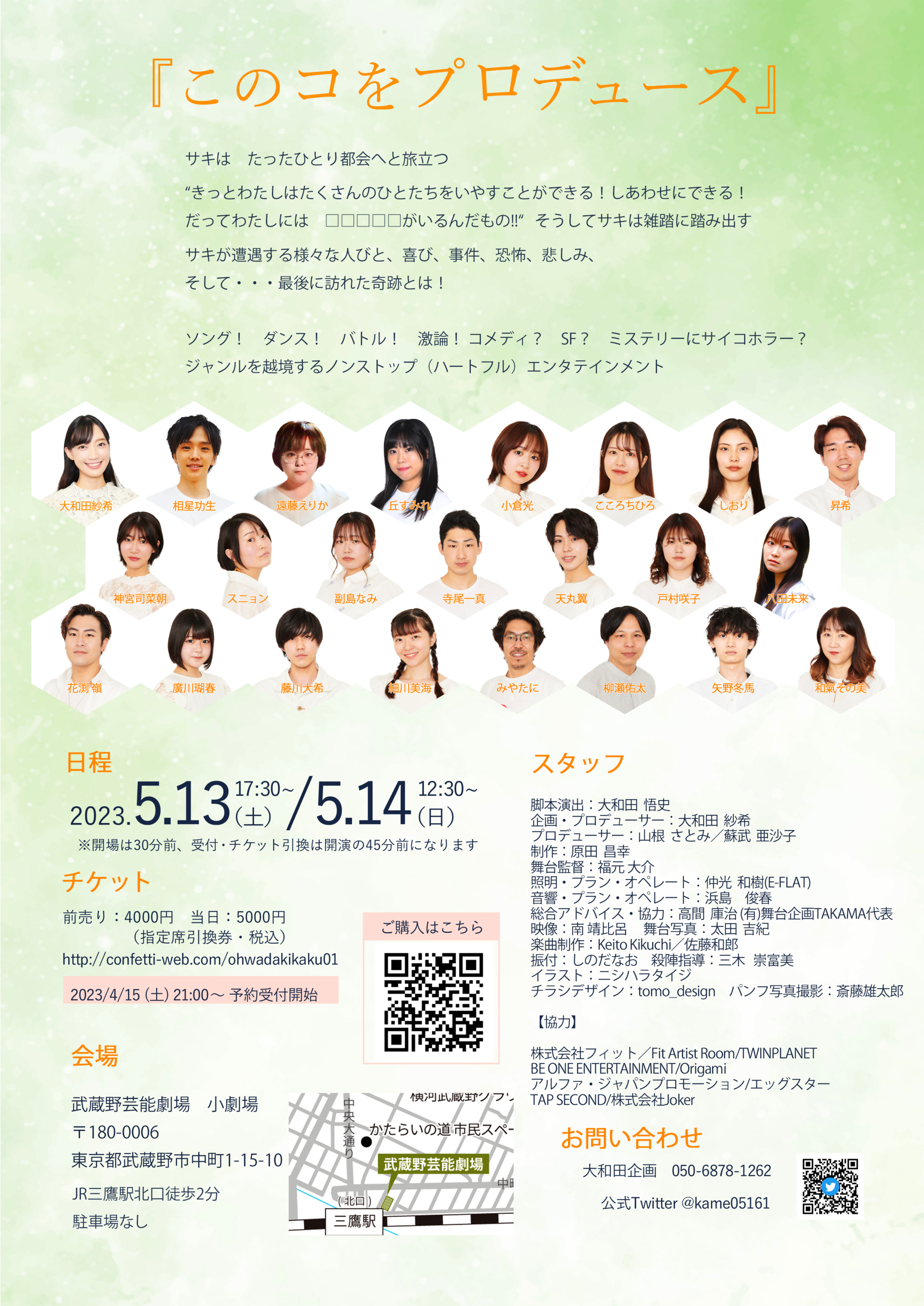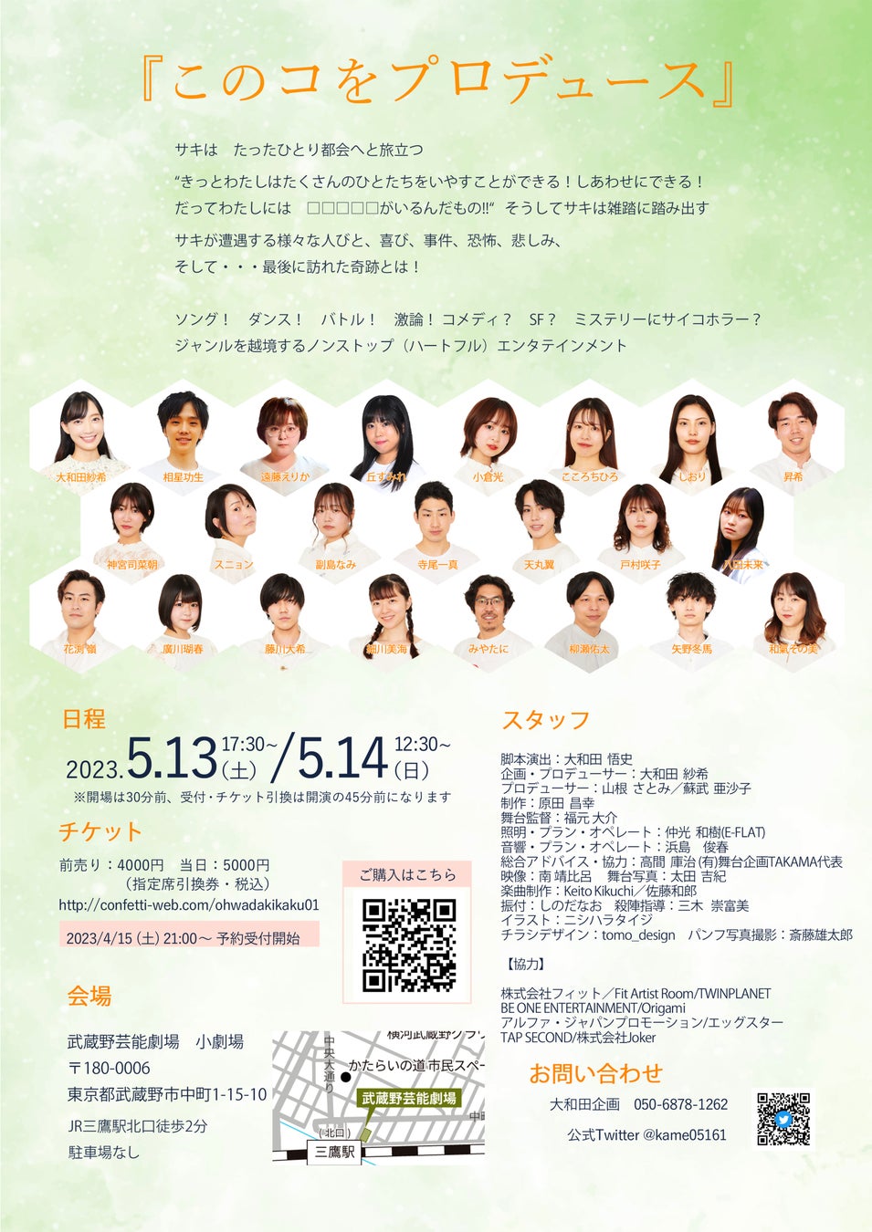 大和田企画(代表:大和田 紗希)主催、『このコをプロデュース』が2023年5月13日 (土) ~2023年5月14日 (日)に武蔵野芸能劇場 小劇場(東京都武蔵野市中町1丁目15番10号)にて上演されます。