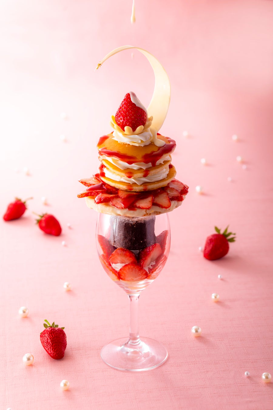 「苺とチョコのメルティーパフェ」は、苺パンケーキ×苺タルト×フォンダンショコラの3つを掛け合わせたハイブリットなパフェ。フォンダンショコラの中からとろけ出る甘いチョコレートソースに加え、苺を贅沢に敷き詰めたタルトとパンケーキの上にはお好みでホワイトチョコレートソースとベリーソースをかけて召しあがっていただくことができ、甘酸っぱい苺と芳醇なチョコレートの王道コラボレーションを溢れんばかりのパフェスタイルでご堪能いただけます。