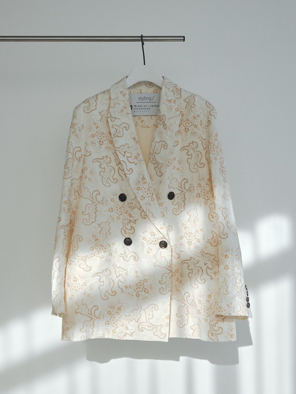 ゆったりとしたリラックス感が上品なダブルブレステッドジャケット。styling/定番のボクシーなシルエットを本コレクション限定柄で制作いたしました。ラペル(衿)をワイド設定にし、ハンサムな印象に。フロント部分はウエストを適度にシェイプさせ、腰位置が高く見えるようデザインされています。