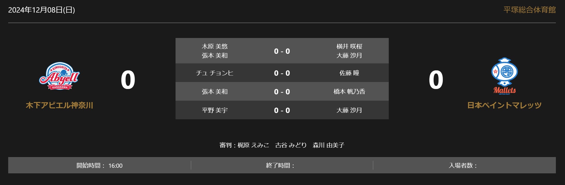 ノジマTリーグ 2024-2025シーズン 公式戦 12月8日開催 木下アビエル神奈川 vs 日本ペイントマレッツ 対戦オーダー発表