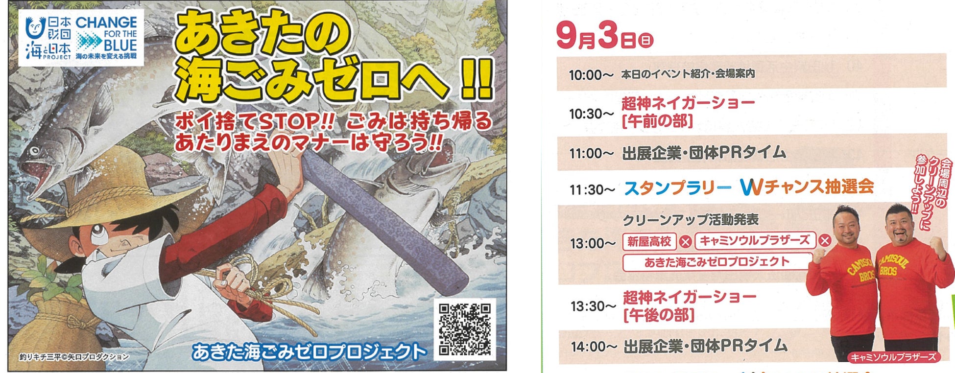 3日(日)13時からのステージイベントでは、秋田発のダンスパフォーマンスおじさんズ「キャミソウルブラザーズ」が、新屋高校生徒会の皆さんと、生徒会が取り組む環境保護や地域の清掃活動を紹介するほか、あきた海ごみゼロプロジェクトの活動についても報告し、今後環境を守っていく為に身近なとことろでできる取り組みは何かなどを考えるトークショーを開催します。ステージ終了後には、来場者の方に声を掛け、キャミソウルブラザーズに釣りキチ三平くんも加わり、楽しく会場周辺の清掃活動を行います。