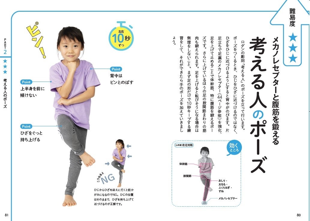 著者の西村 猛さんは、「子どもの姿勢改善のためには、”よい姿勢の形を知り、よい姿勢をとる習慣をつけてあげること”がポイント」と語ります。さらに「最も大切なのは、お子さん自身が楽しくとり組める方法で実践すること。なぜなら、子どもは「楽しい!」という気持ちがあるからこそ、飽きずに続けていくことができるからです」。本書では「考える人のポーズ」「しんにょうのポーズ」「ボディビルダーのポーズ」など、ユニークなポーズ21種類が登場。筋肉もリラックスしていて、親子でも取り組みやすいお風呂上がり・寝る前に10秒、集中して試すことをおすすめします。 「姿勢改善につながる効果がある楽しいポーズ」をぜひ親子で試してみましょう。