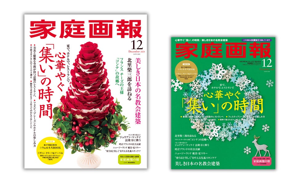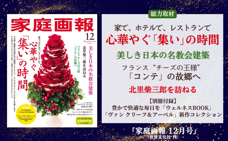 株式会社世界文化社は、『家庭画報 12月号』を11月1日(金)(関⻄・東海地区は10⽉31⽇)に発売しました。巻頭特集「心華やぐ集いの時間」では、ご自宅・ホテル・レストランで過ごす幸せなホリデーシーズンのひとときをご紹介。「美しき日本の名教会建築」では、心洗われる日本各地の名教会建築をご案内します。また、フランスに現地取材をし魅力に迫った「‟チーズの王様”コンテの故郷へ」や、特別インタビューによる「北里柴三郎を訪ねる」、二大別冊付録など、今年を締めくくるにふさわしい華やかな内容でお届けします。