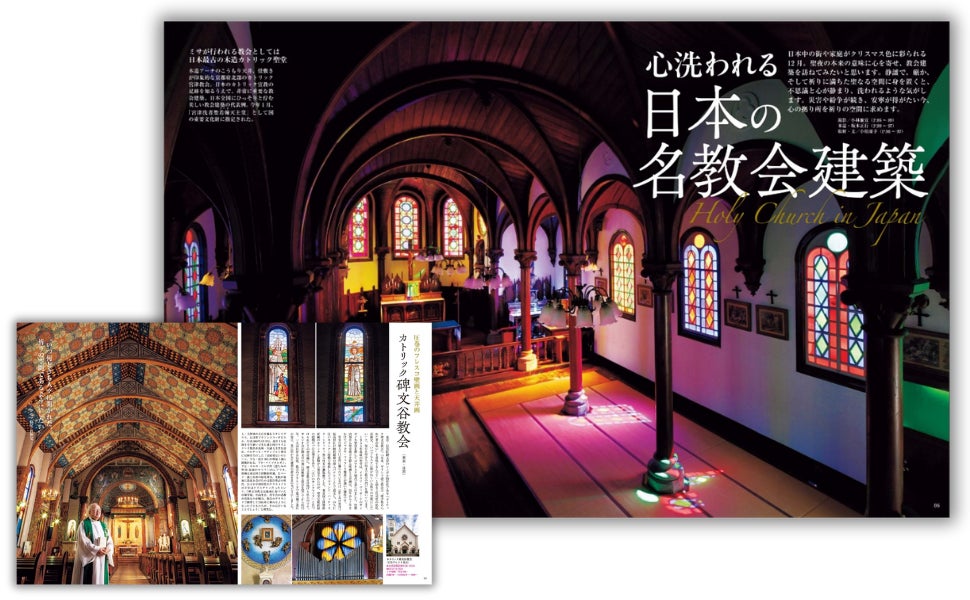 静謐で、厳か、そして祈りに満ちた聖なる空間に身を置くと、不思議と心が静まり、洗われるような気がします。災害や戦争が続き、安寧が得がたい今、心の拠り所を祈りの空間に求める。聖夜の本来の意味に心を寄せ、「カトリック宮津教会」、「カトリック田平天主堂」、「旧五輪教会堂」、「長崎と天草地方の潜伏キリシタン関連遺産」、「カトリック碑文谷教会」など日本各地の教会建築を訪ねました。