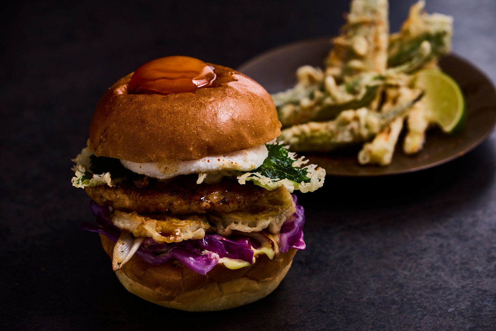 秋の味覚を詰めた「SUPER月見フェア」では、透明醬油に漬けた卵黄を、月と地球が最も接近する満月「スーパームーン」をイメージして上のバンズにはめこんでいます。パティは玉ねぎをたっぷりと使用してふんわり食感にした鶏つくねに甘辛いタレをまとわせ、蓮根と大葉の天ぷら、焼いたメレンゲは曇に見立てることで、ハンバーガー全体でお月見を表現しました。