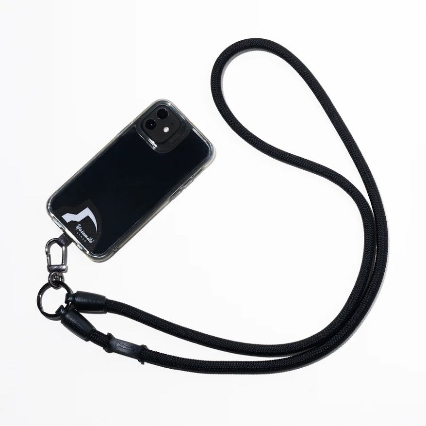 お使いのスマートフォンケースにはさむだけで、あなたの両手を自由に。コーディネートのアクセントにも。日本製ナイロンを使用したクライミングロープで、肩に負荷がかかりづらく、わずわらしい“ねじれ”もありません。キーホルダー等はレザー製フックパーツに。