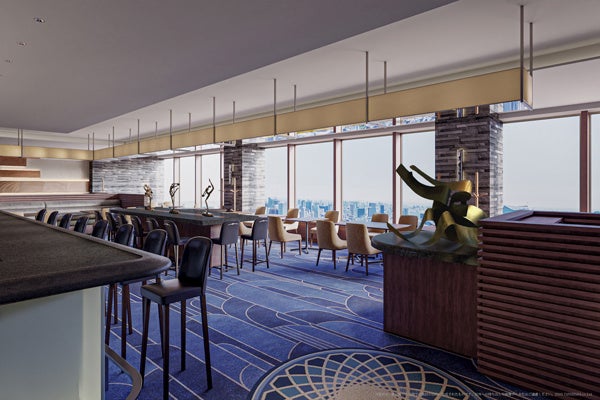 デザインコンセプト「Cool&Stylish」を継承し、夜景を青白く浮かび上がらせるブルーと、アールデコのクールモダンなデザインを掛け合わせます。ホテルのバーラウンジにふさわしい大型の椅子や、窓に差し込む光線をモチーフとしたアートオブジェを配置した洗練された都市的な空間は、遊び心をくすぐる大人の社交場となります。デイタイムからナイトタイムまでカジュアルに肩肘張らず美味しいお酒とお料理をお楽しみいただけます。