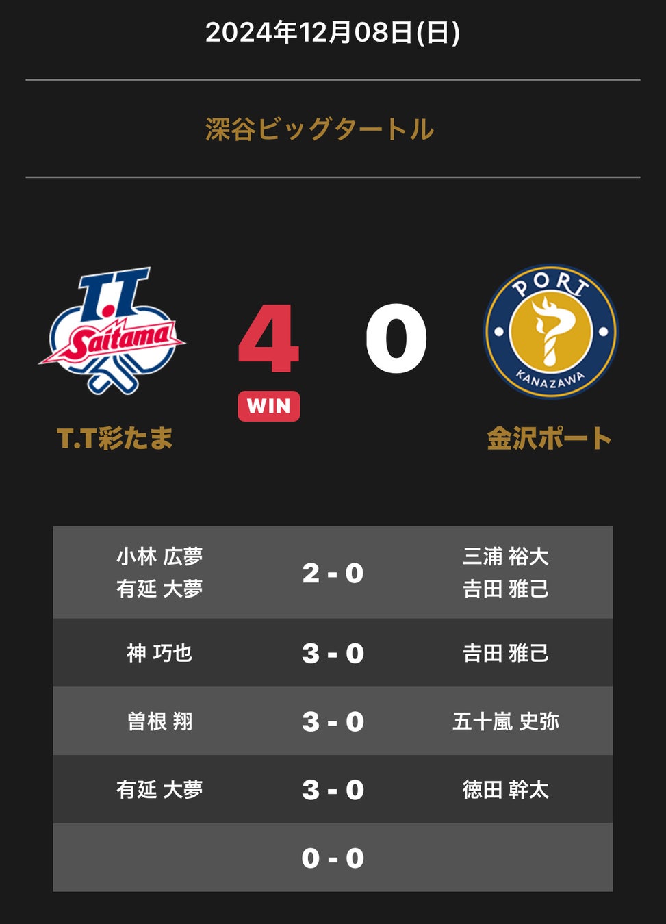 ノジマTリーグ 2024-2025シーズン 公式戦 12月8日開催 「T.T彩たま vs 金沢ポート」の試合は、4-0でT.T彩たまが勝利しました。