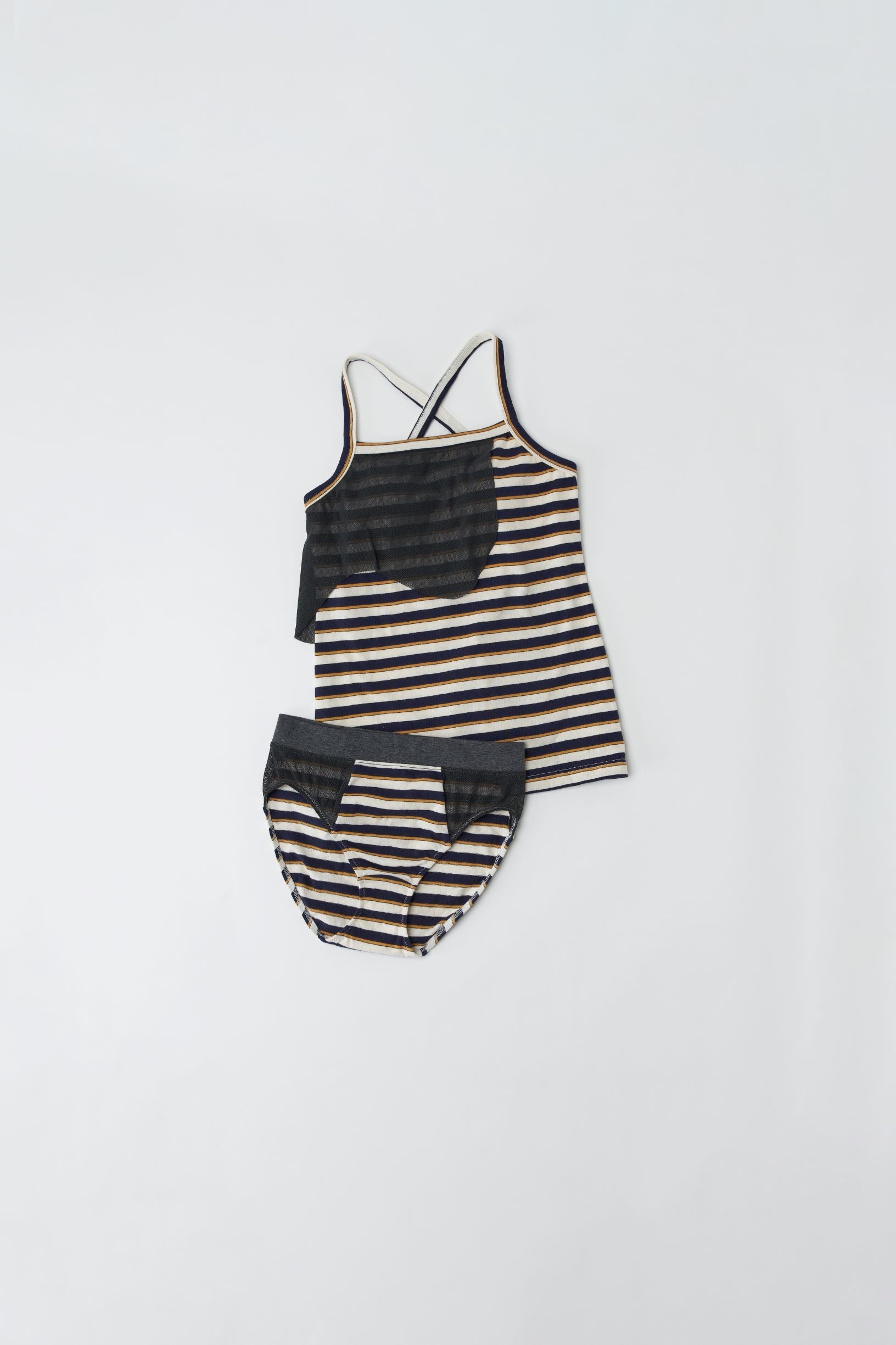 曲線にカットしたコットンチュールがポイントのカップ付きキャミソールと、セットのショーツ。kotohayokozawaらしい、楽しく自由な装いを叶えるアイテムです。