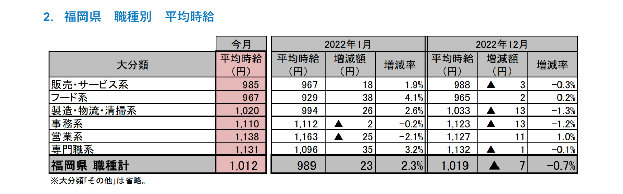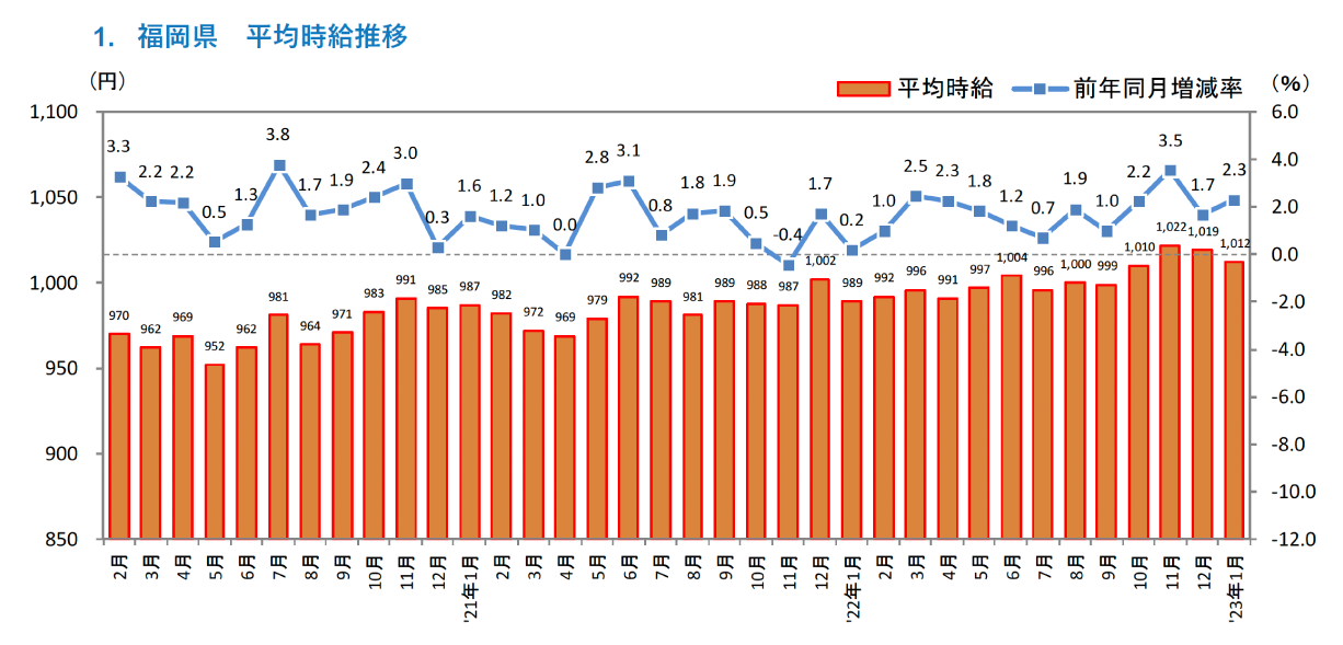 ■ 福岡県の平均時給は1,012円(前年同月989円、前月1,019円)