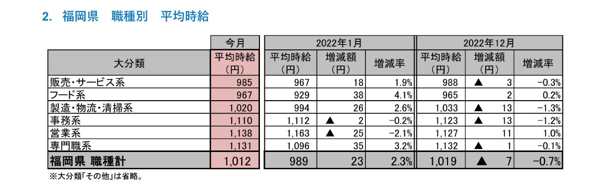 [福岡県版]2023年1月度 アルバイト・パート募集時平均時給調査 福岡県の1月度平均時給は前年同月より23円増加の1,012円
