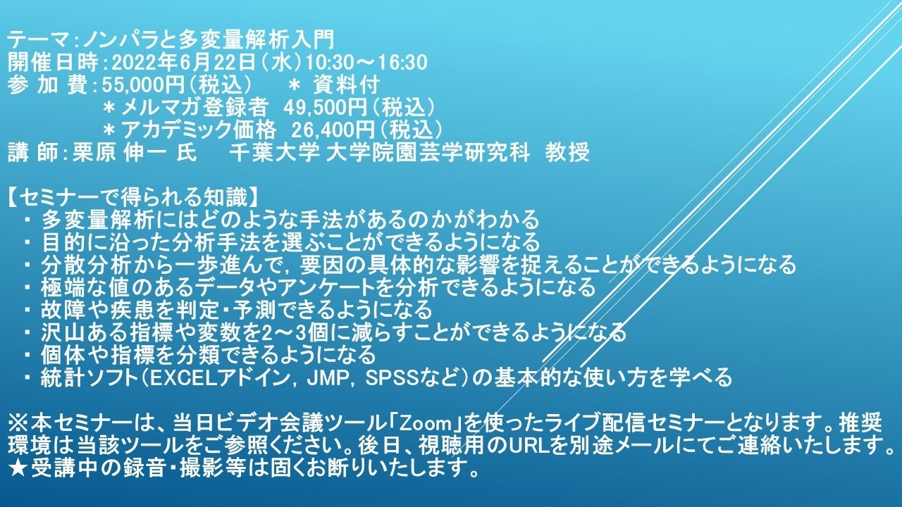 先端技術情報や市場情報を提供している(株)シーエムシー・リサーチ(千代田区神田錦町: https://cmcre.com/ )では、 各種材料・化学品などの市場動向・技術動向のセミナーや書籍発行を行っておりますが、 このたび「ノンパラと多変量解析入門」と題するセミナーを、 講師に栗原 伸一 氏 千葉大学 大学院園芸学研究科 教授)をお迎えし、2022年6月22日(水)10:30より、 ZOOMを利用したライブ配信で開催いたします。 受講料は、 一般:55,000円(税込)、 弊社メルマガ会員:49,500円(税込)、 アカデミック価格は26,400円(税込)となっております(資料付)。