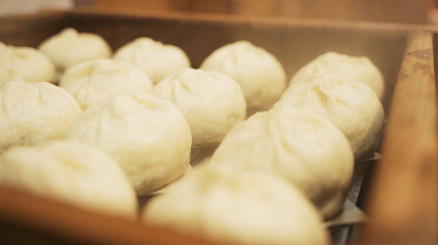 大阪みやげの定番ともいえる〈551 蓬莱〉の豚まん。ふっくら、まんまる、色白の生地はほんのり甘め。口の中では、甘い玉ねぎとジューシーな豚肉のハーモニーが広がります。熟練の職人が、一つひとつ手で包む豚まん。アツアツの蒸したては店頭カウンター席でも食べられます。