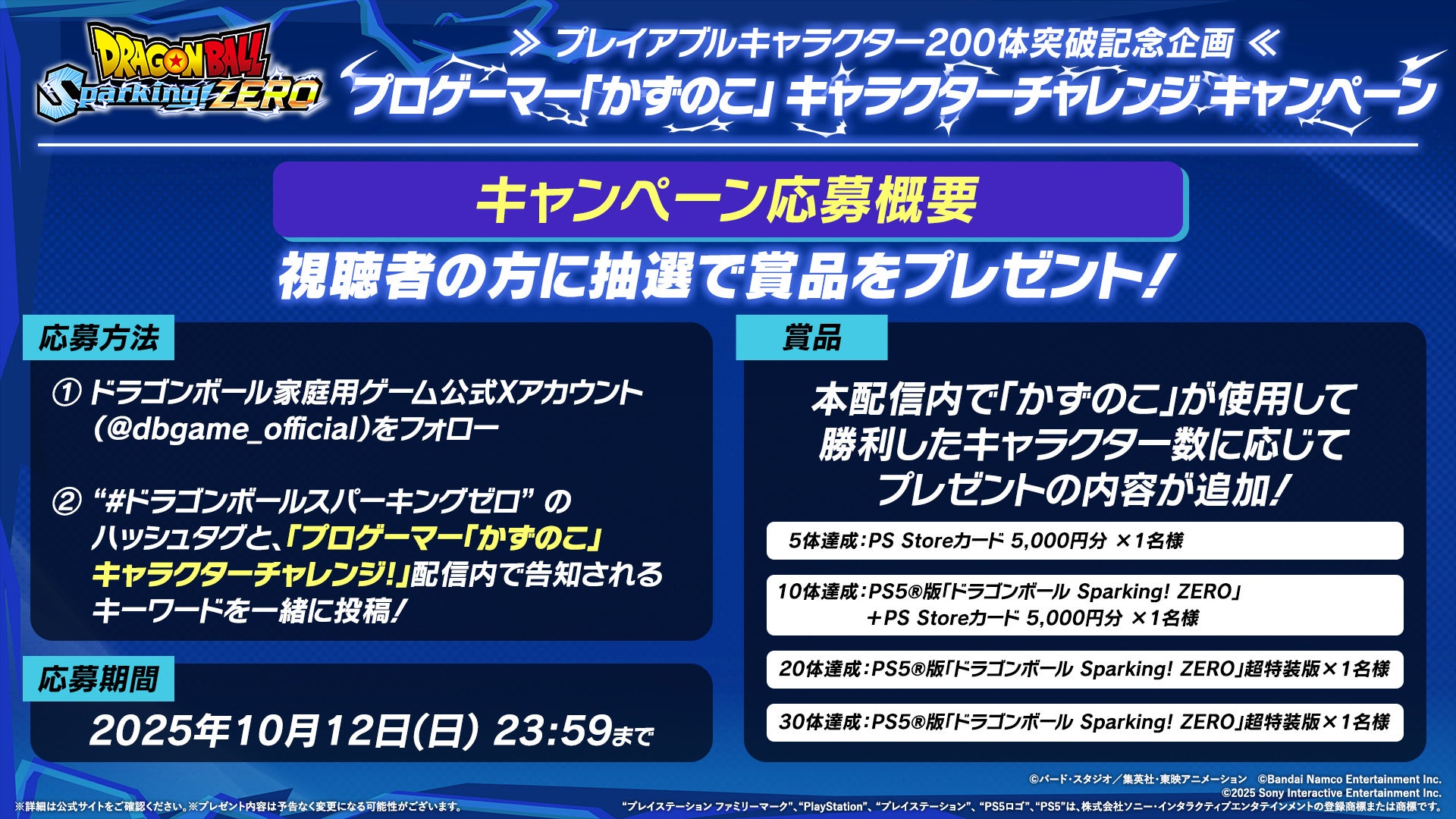 ②”#ドラゴンボールスパーキングゼロ”のハッシュタグと、 『「プロゲーマー「かずのこ」キャラクターチャレンジ』配信内で告知されるキーワードを一緒に投稿