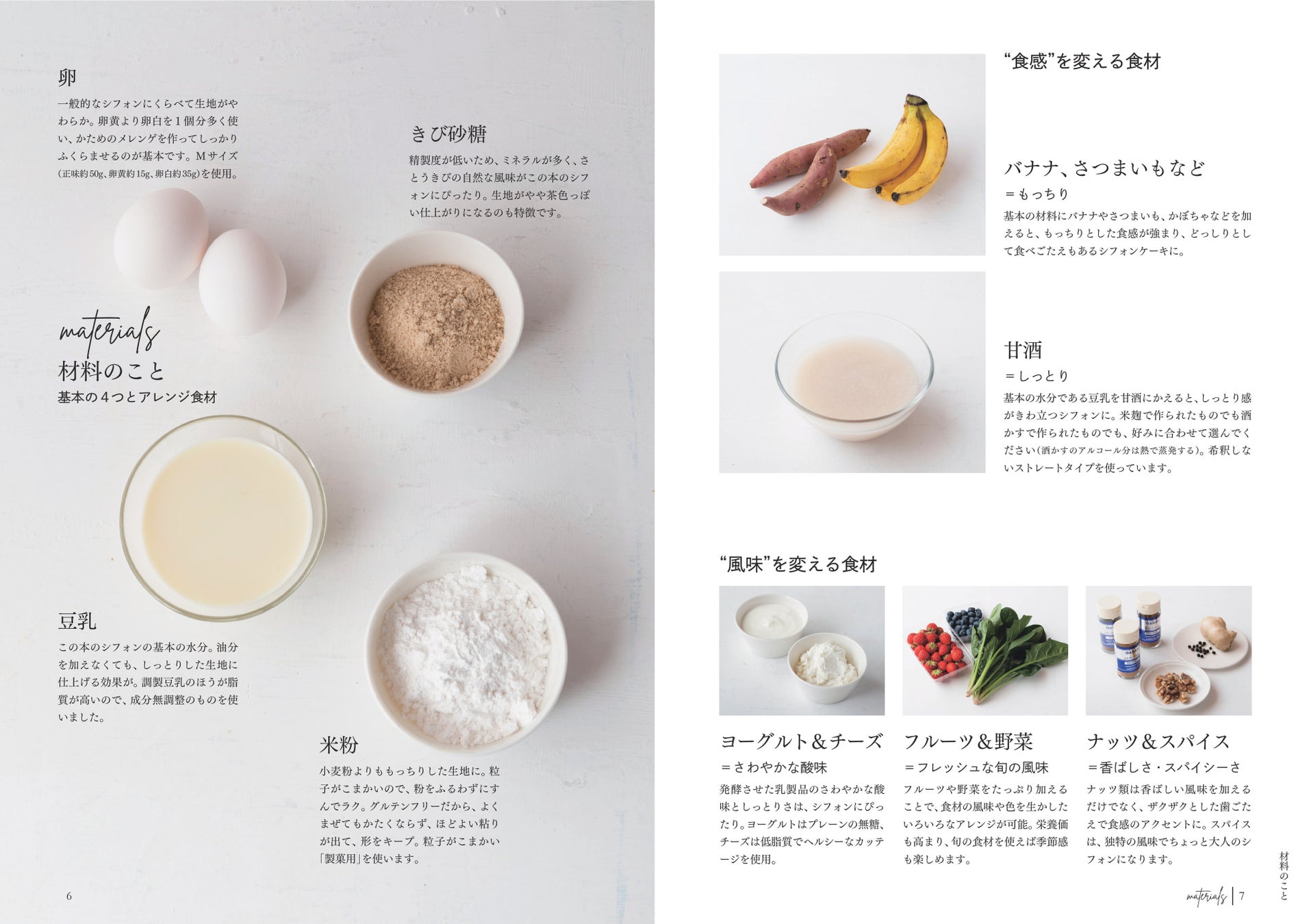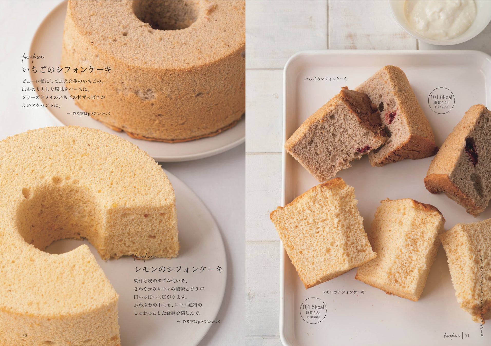 コツをつかんだら味や食感のバリエ―ションを楽しめるように、フルーツやチョコを加えたシフォンケーキ、野菜やハーブを使ったお食事系シフォンのレシピもたくさん紹介しています。