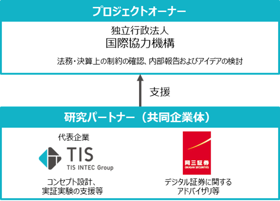JICA:プロジェクトオーナー ・法務・決算上の制約の確認 ・内部報告およびアイデアの検討 TIS:研究パートナー(共同企業体代表企業) ・デジタル債発行の投資体験(CX)コンセプト設計支援 ・デジタル債発行、投資家コミュニケーションの実証実験 ・ブロックチェーン技術の活用可能性に係る検討 岡三証券:研究パートナー(共同企業体構成員) ・法務・決算上の制約に関する助言 ・デジタル債発行事例の研究 ・関係者の特定・整理および手続き・契約の整理 |
