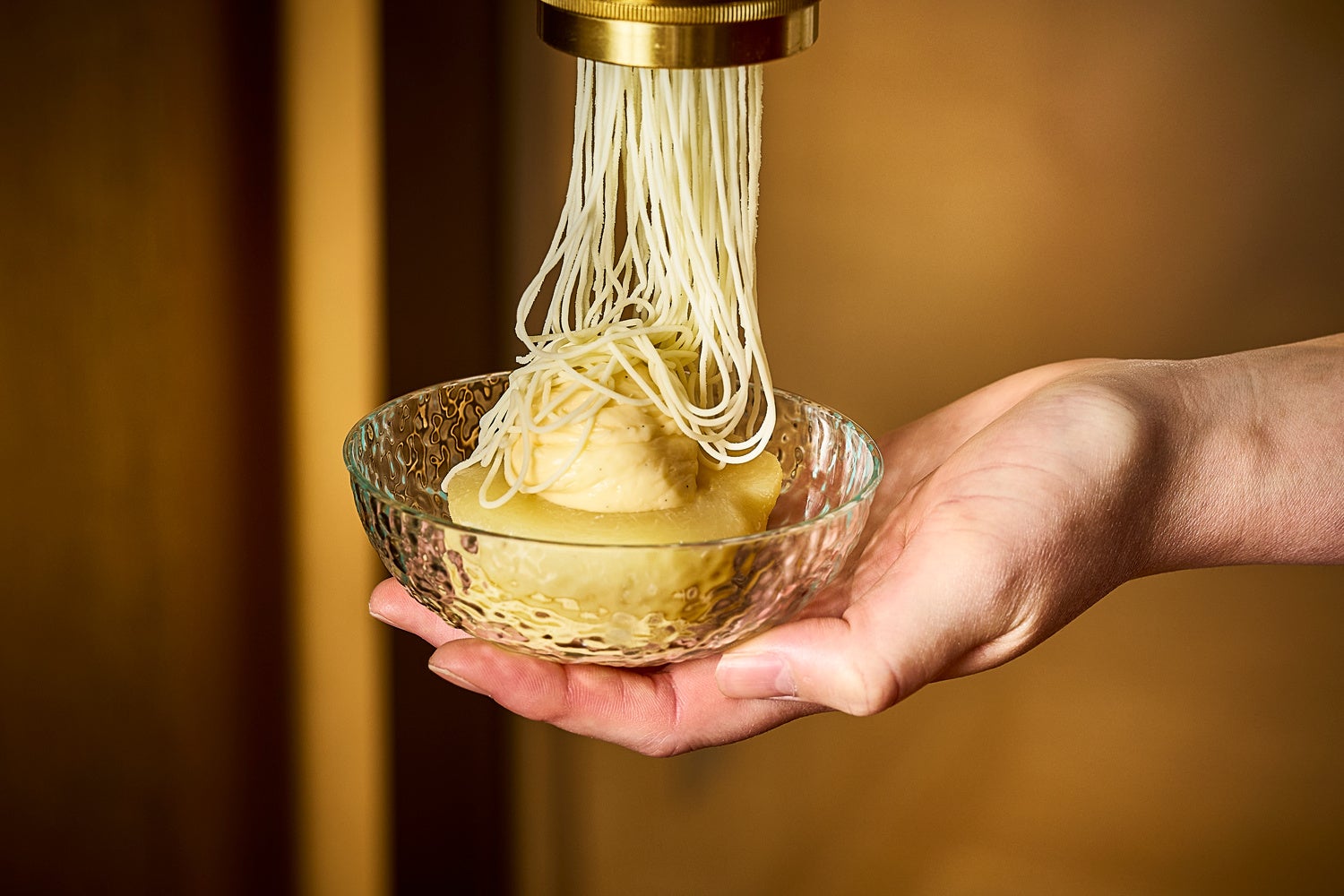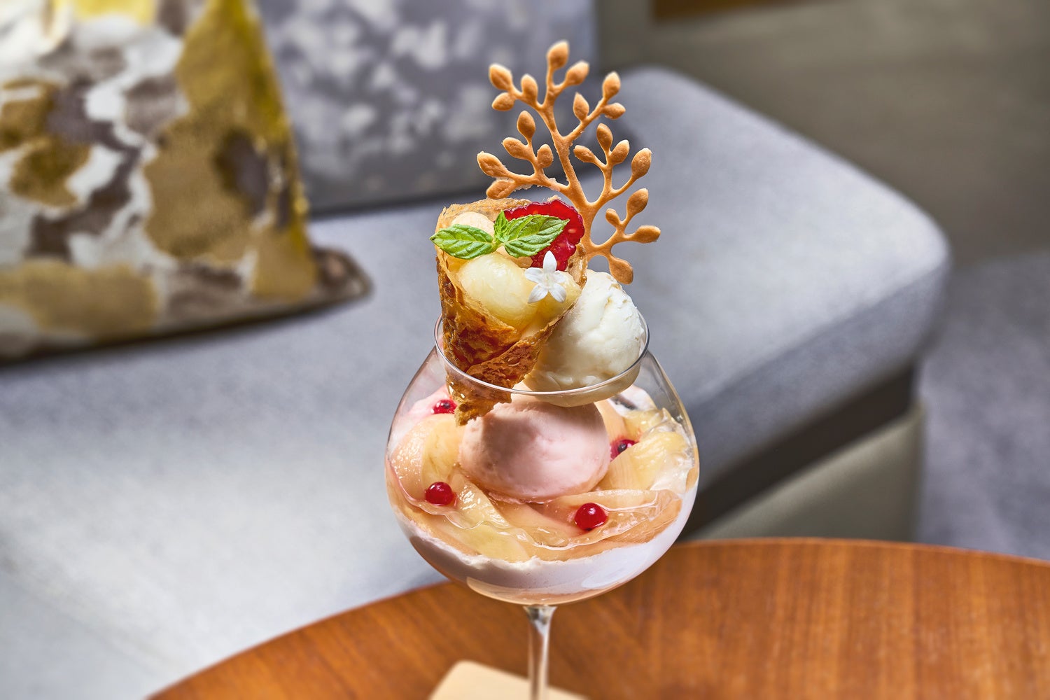 和歌山県紀の川市桃山町で育つ「あら川の桃」を贅沢に使用し、7月限定で販売する特別なパフェをご用意します。温暖な気候と紀の川付近の水はけのよい土壌で育まれたブランド桃として名高い「あら川の桃」は、みずみずしく、まるごとかぶりつくと果汁がポタポタと滴り落ちるほどの特徴を持ちます。トップにはシュー生地で木と葉の形に模った飾りと、カップチュイールに丸くくり抜いた桃を美しく盛り付け、その下にバニラアイスと桃ソルベを重ね、冷たさと桃の風味が調和した涼やかな味わいをお楽しみいただけます。中段には花びら状に美しくスライスした桃を丁寧に並べ、華やかなシャンパンジュレ、桃のシャンティ、桃のジュレ、レモンジュレ、そして底には桃果肉と、それぞれ異なる桃の表情を層状に重ねた贅沢な仕上がりです。