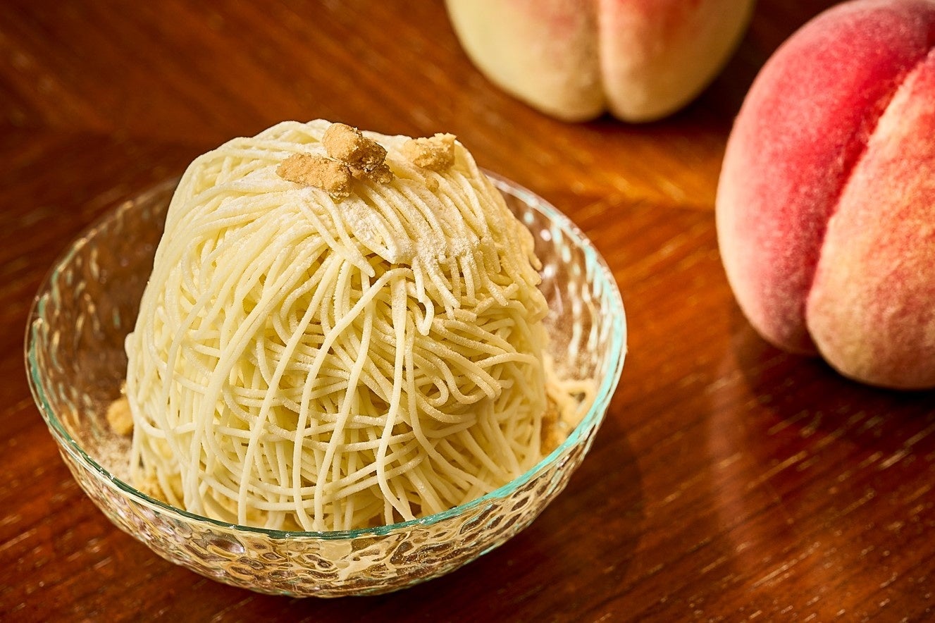 ご注文を受けてから仕上げる線の細いモンブランクリームは柔らかな口当たりが特徴で、桃半玉を贅沢に使用した食べ応えのある一品。