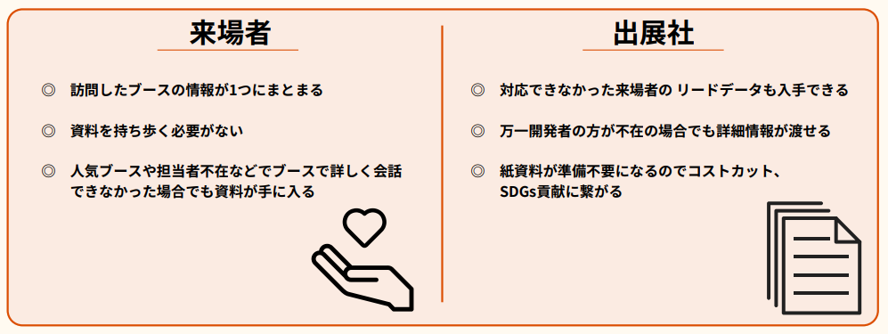 「Colleqt(コレクト)」は、出展社が用意したパンフレット等の説明資料を、会期中に来場者がデータで取得できる新サービスです。