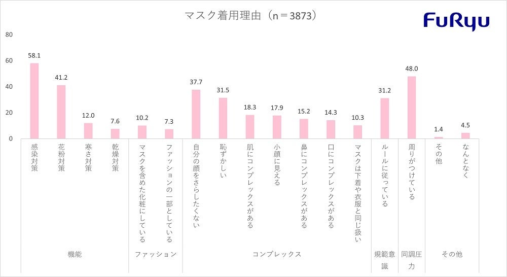 - ■マスク着用理由は「感染対策」がトップ!「コンプレックス対策」や「周囲との関係性」が上位に
