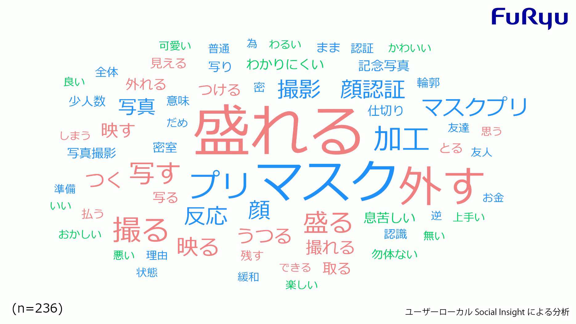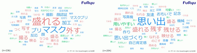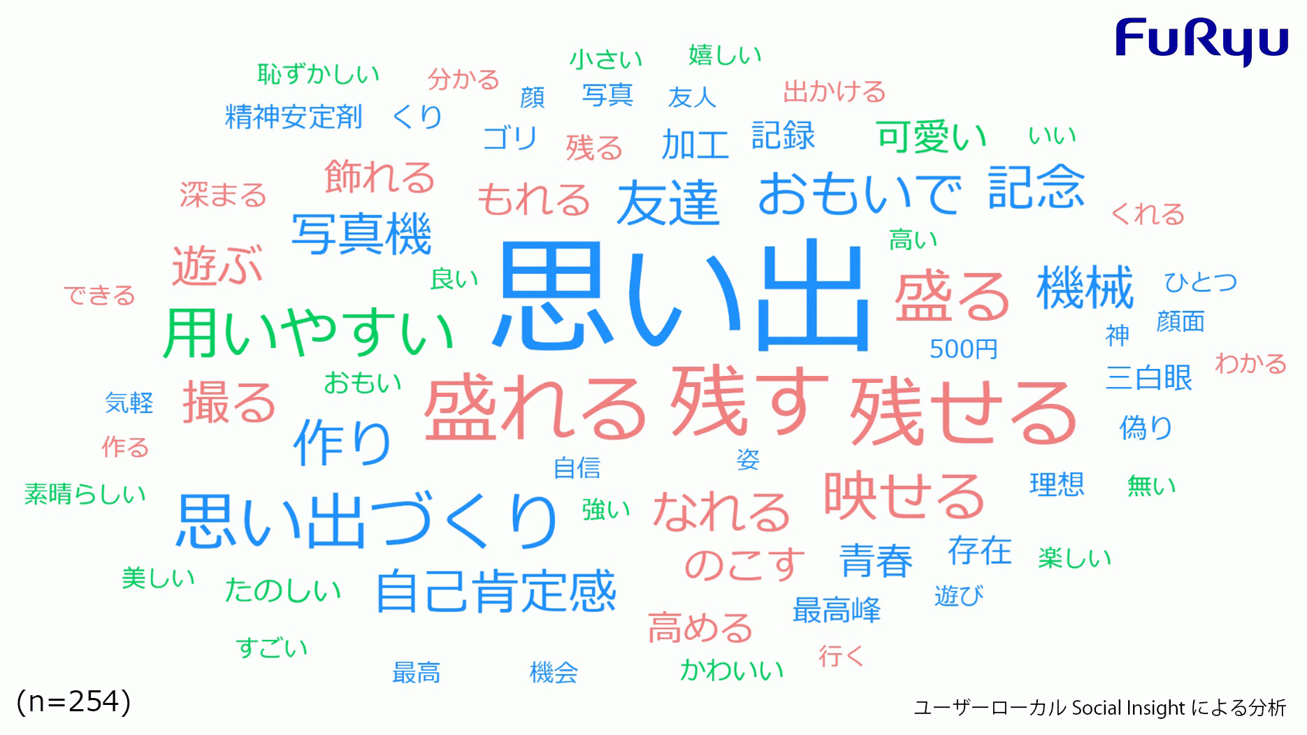 プリ撮影時にマスクを着用しなかったと回答した方に「つけなかった理由」をヒアリングしたところ、最多回答は「盛れるから」となり“写り”への影響に関連する事柄が多くあがり、プリに対する「盛る」ことへの期待がうかがえる一方で、同じ方に「プリの価値とは」とヒアリングすると「盛れる」という回答以上に「思い出」というワードが多く集まりました。様々な理由を背景にマスク着用が日常化する中、プリは貴重な学生生活の「思い出」を残す大切な役割を果たしていたのではないだろうかと我々は考えます。