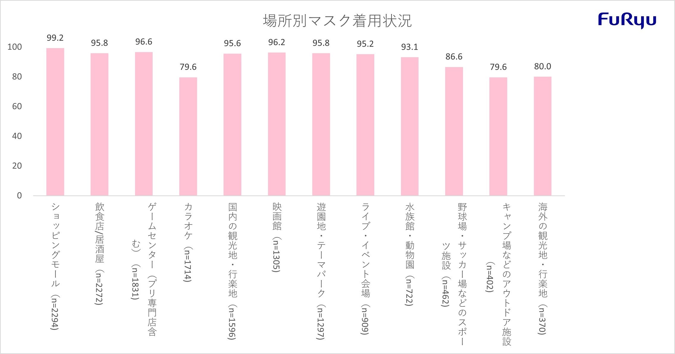- ■現在も「マスク着用」が96.7%!着用場面に差はほとんどなし!!