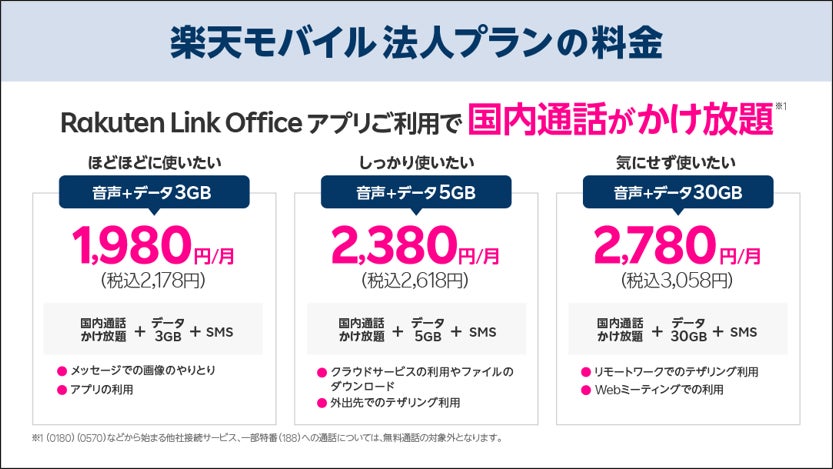 - 月間データ容量に応じた3プランを用意。国内通話かけ放題や国際通話も利用可能な「楽天モバイル法人プラン」を提供 –