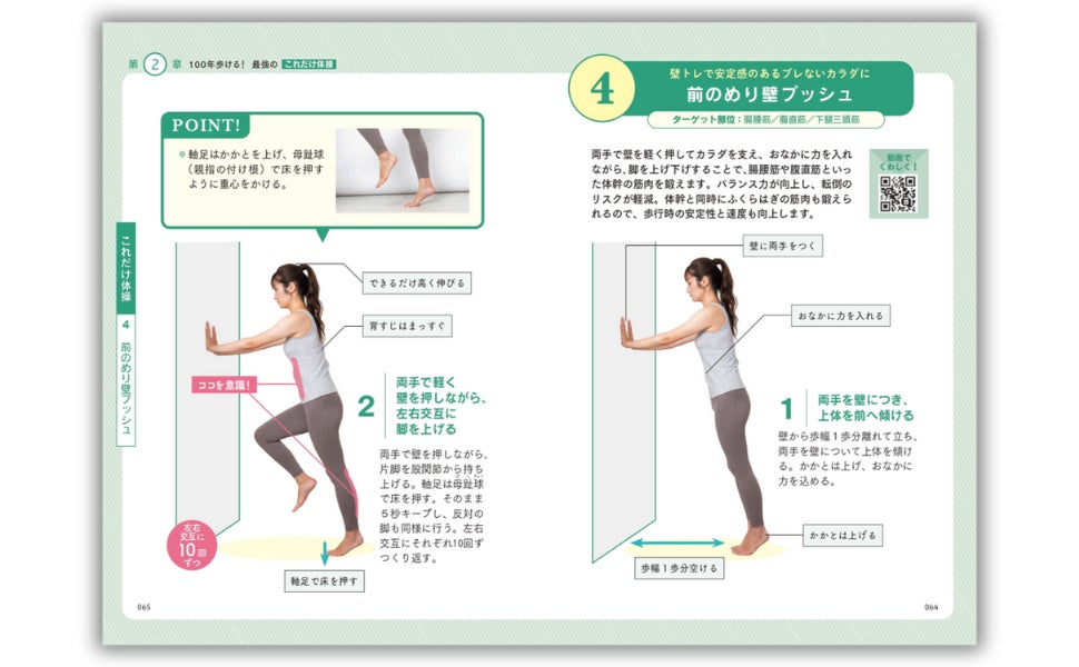 両手で壁を軽く押してカラダを支え、おなかに力を入れ ながら、脚を上げ下げすることで、腸腰筋や腹直筋といっ た体幹の筋肉を鍛えます。バランス力が向上し、転倒の リスクが軽減。体幹と同時にふくらはぎの筋肉も鍛えら れるので、歩行時の安定性と速度も向上します。