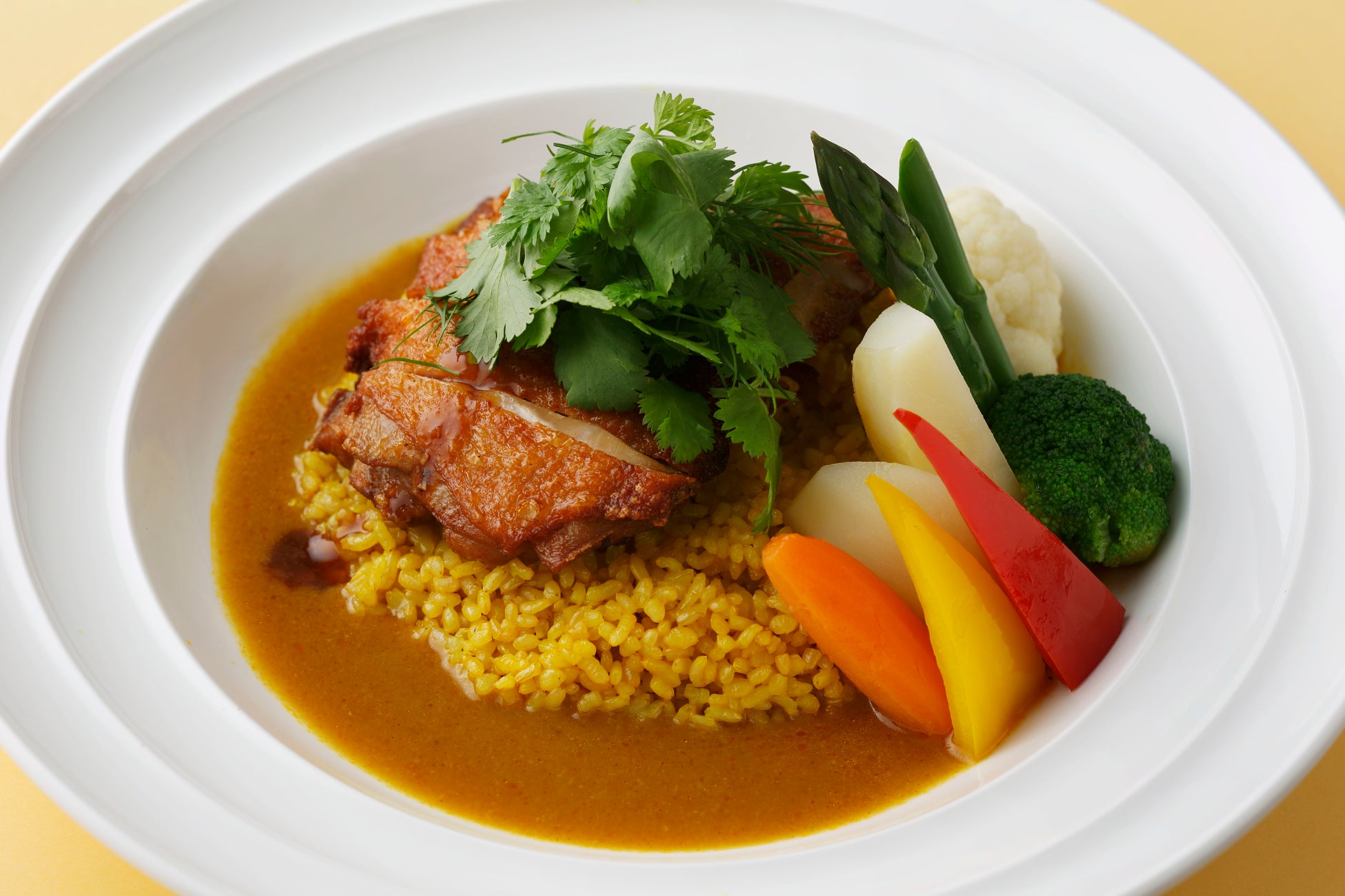 ブイヨンスープと特製だれに漬け込んだ鶏もも肉で、スパイシーに仕上げたスープカレーを“Jシリアル”サフランライスとともに愉しんでいただく一皿。