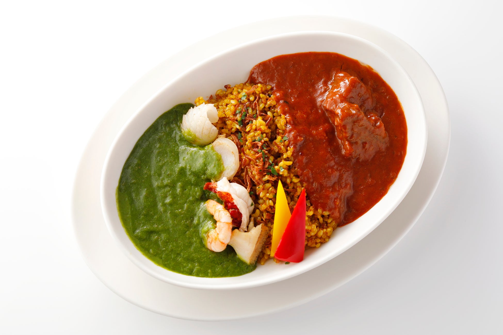 じっくり煮込んだ牛ほほ肉入りレッドカレー、オマール海老、鮑などのシーフードを贅沢に使用したグリーンカレーを愉しめる2色カレー。