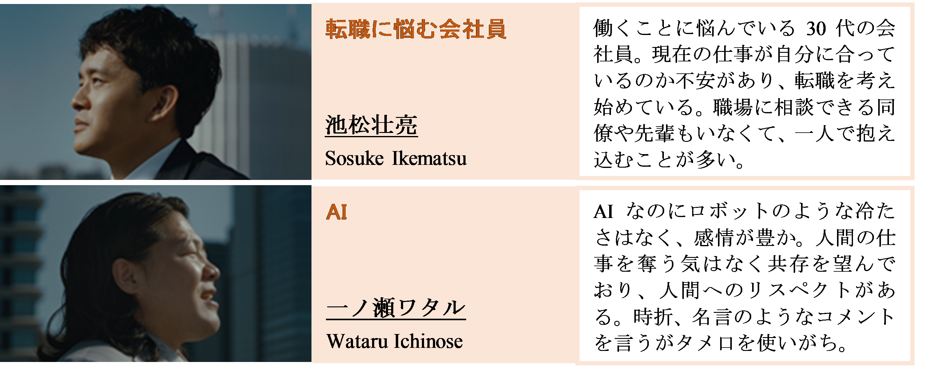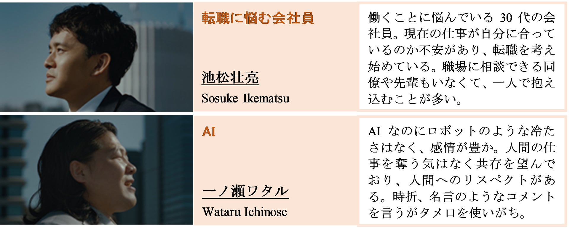 オフィスビルの屋上で、会社員の主人公(池松さん)がため息をつきながら空を眺めていると、隣に現れた人物(一ノ瀬さん)が突然「働くってなんだろう…って思ってない?」と話しかけてきます。その男性はにこやかに「AI」と書かれた名刺を差し出しますが、心を見透かされ驚いた主人公は怪訝な表情。AIを名乗る男性は主人公のノートパソコンを手に取ると、人間離れした超高速のキーボードさばきで作業の途中だった資料を完成させてしまいます。