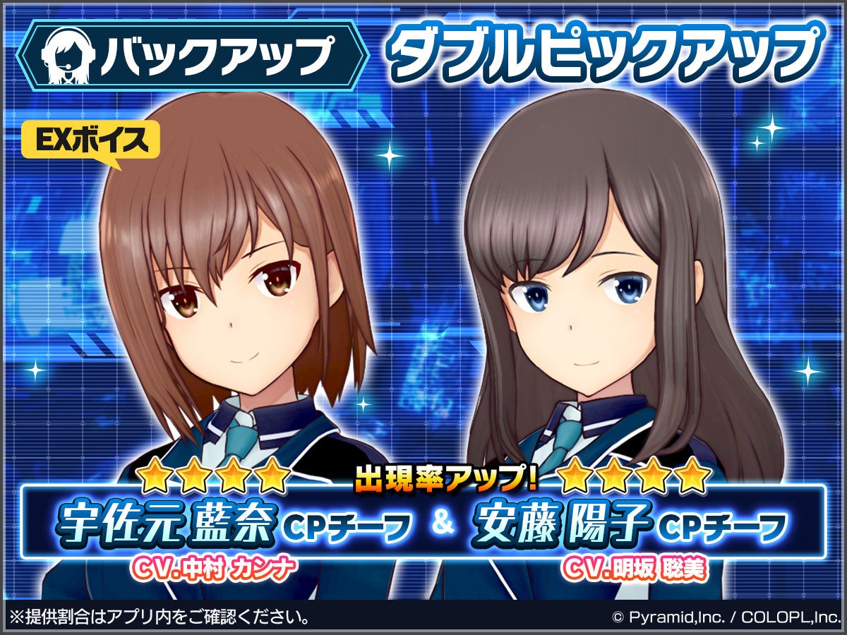 βテスト版の公開にあわせて、バックアップ★4キャラ「宇佐元 藍奈【CPチーフ】(CV:中村 カンナ)」と「安藤 陽子【CPチーフ】(CV:明坂 聡美)」をピックアップしたスカウトが開催中です。