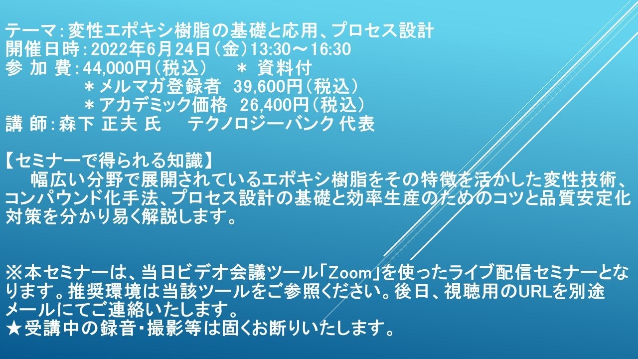 先端技術情報や市場情報を提供している(株)シーエムシー・リサーチ(千代田区神田錦町: https://cmcre.com/ )では、 各種材料・化学品などの市場動向・技術動向のセミナーや書籍発行を行っておりますが、 このたび「変性エポキシ樹脂の基礎と応用、プロセス設計」と題するセミナーを、 講師に森下 正夫 氏 テクノロジーバンク 代表)をお迎えし、2022年6月24日(金)13:30より、 ZOOMを利用したライブ配信で開催いたします。 受講料は、 一般:44,000円(税込)、 弊社メルマガ会員:39,600円(税込)、 アカデミック価格は26,400円(税込)となっております(資料付)。