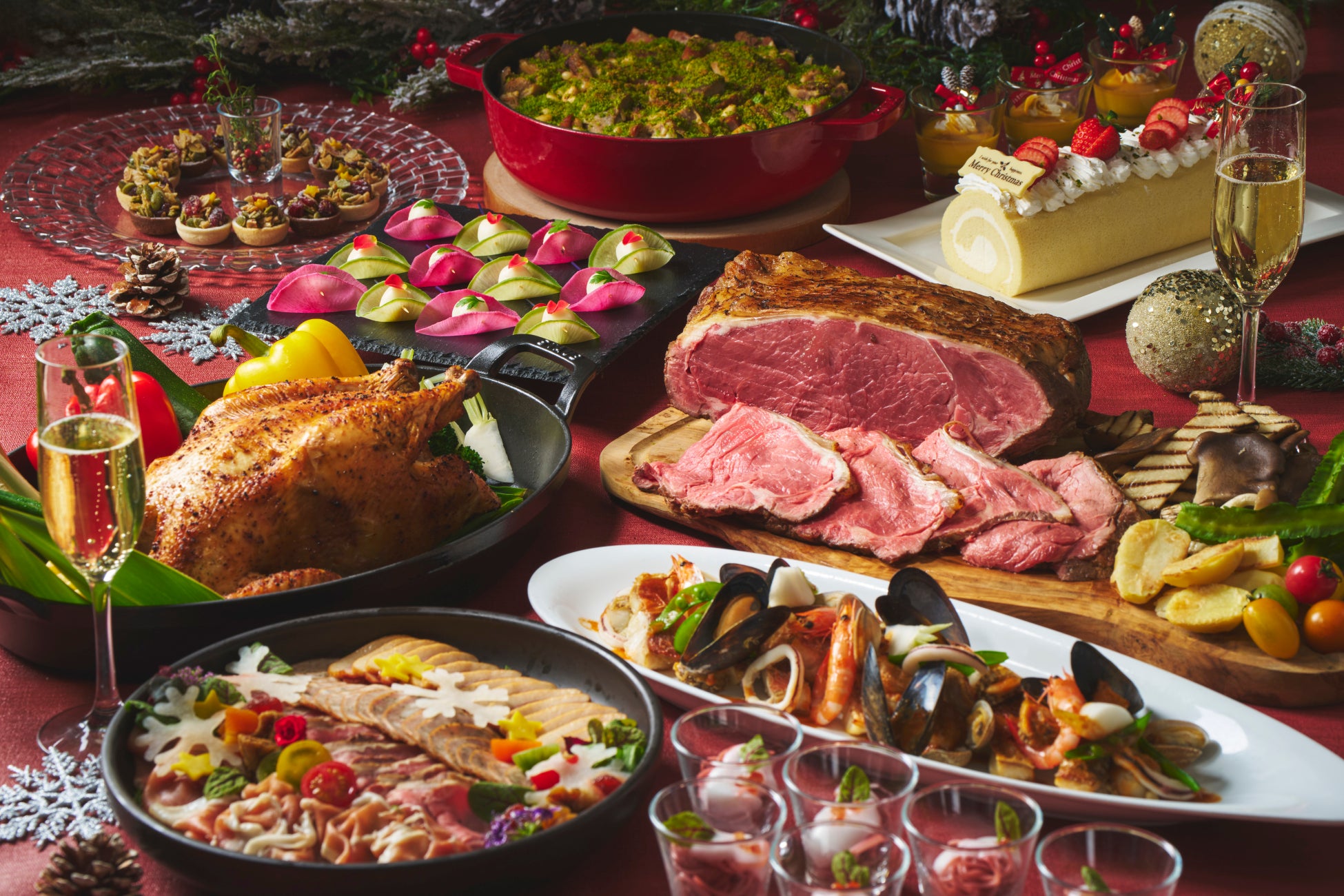 今年の味わいの主役は、クリスマスにはかかせない香ばしく皮目をパリッと焼き上げたローストチキンと、総料理長が丁寧な火入れでジューシーに仕上げたサーロインのローストビーフ。聖夜を彩る10種類以上のデザートと共に、プランタンのランチ&ディナーを心ゆくまでお楽しみいただけます。さらに、クリスマス期間にご来店いただいたお子様には、記念としてささやかな「お菓子のプレゼント」もご用意しています。