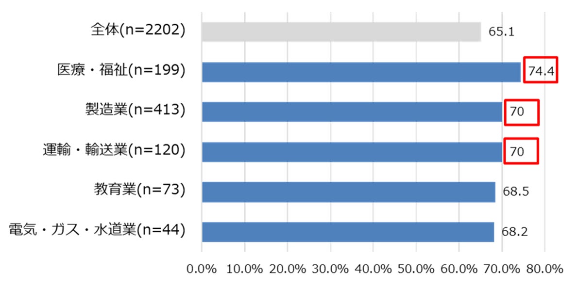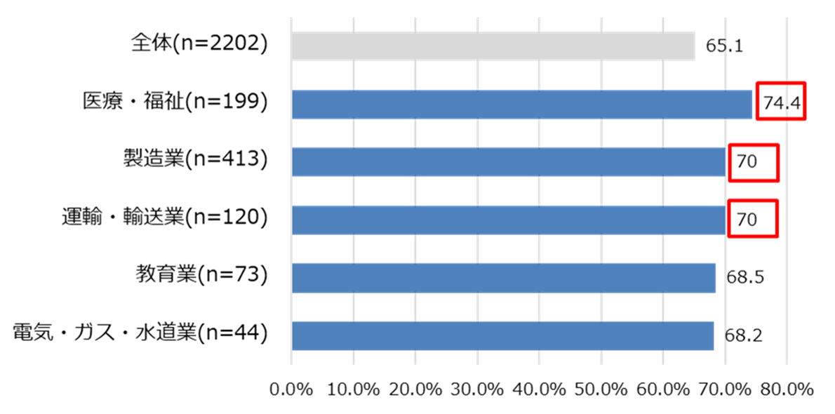 ミドル層(40~54歳)の採用意向は65.1%。業界別では「医療・福祉」「製造業」「運輸・輸送業」が7割以上【図7、8】