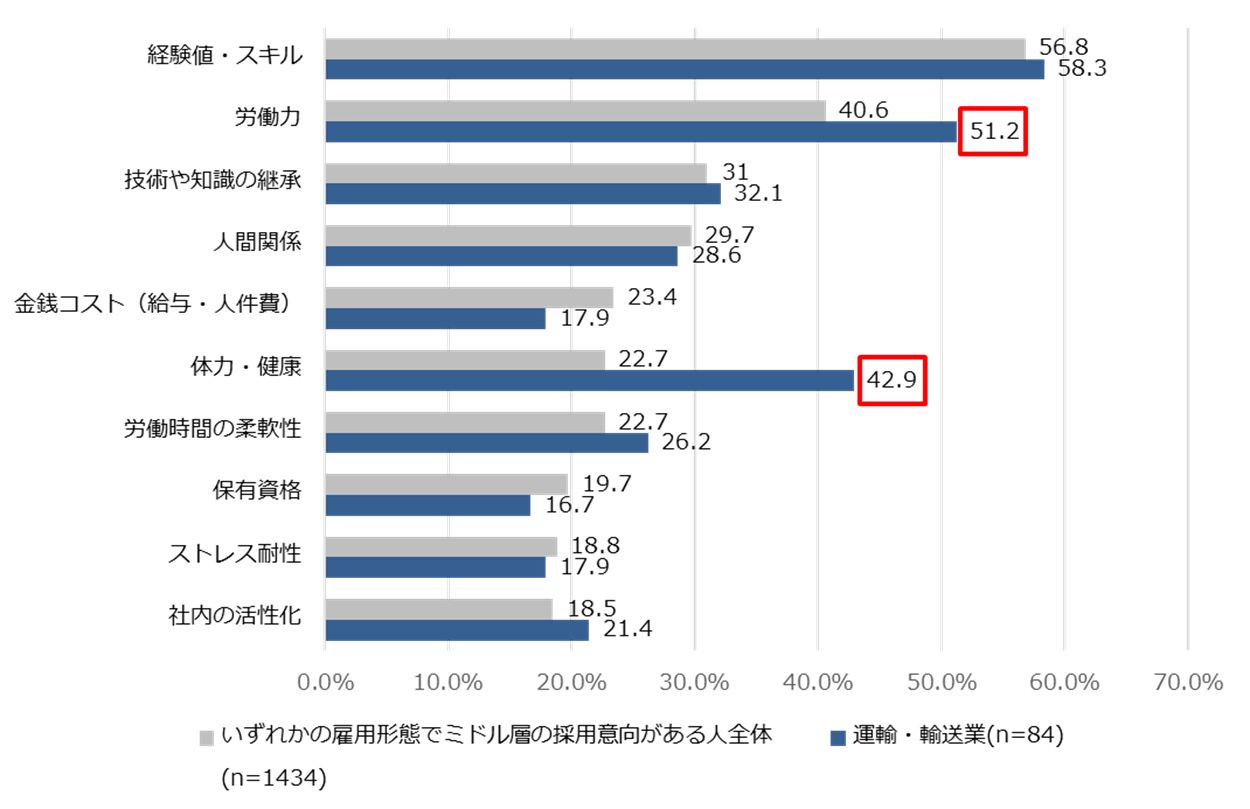 ミドル層(40~54歳)の採用意向がある企業の割合は65.1%だった。業界別でみると「医療・福祉(74.1%)」が最多で、次いで「製造業(70.0%)」「運輸・輸送業(70.0%)」となり、ミドル層に期待することでは、「経験値・スキル(58.3%)」が最も多かった。特に2024年問題を控え、人手不足が高まっている運輸・輸送業では、「労働力(51.2%)」「体力・健康(42.9%)」が全体と比較して10pt以上高かった。人手不足や高齢化の課題がある運輸・輸送業においては、特に労働力としての期待や、体力・健康面での期待もあるようだ。【図7、8】