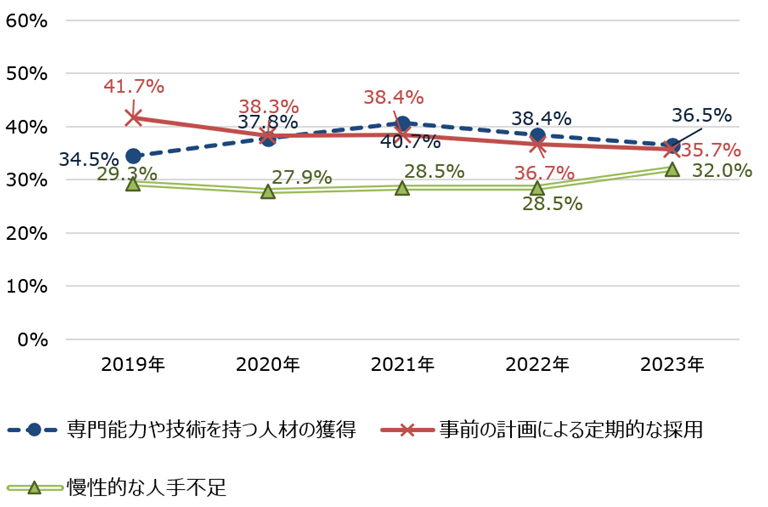 【図2】正社員<新卒>2019年~2023年「採用の理由」の推移(2023年の上位3項目のみ)