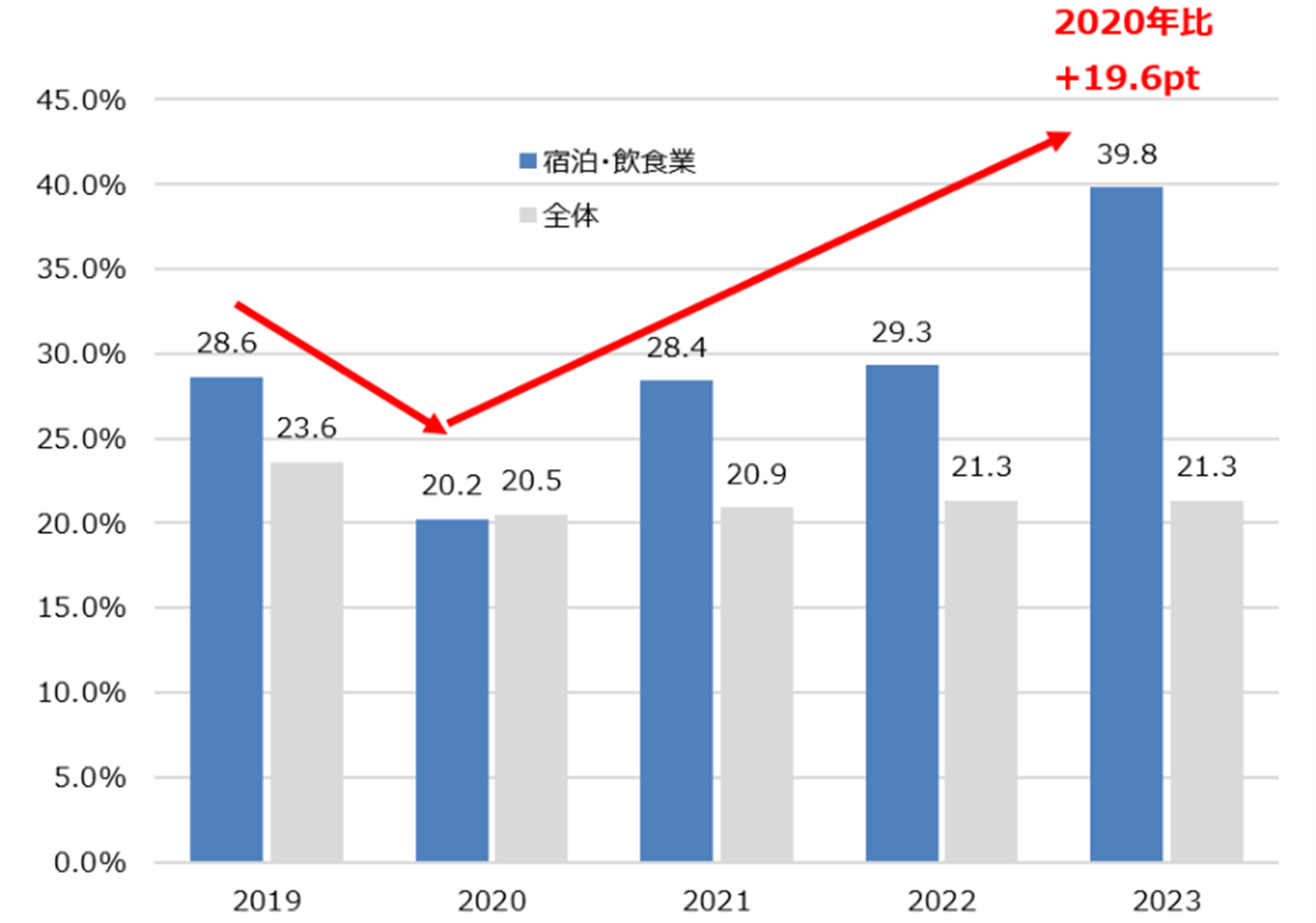 パート・アルバイトから無期直接雇用(正社員)への転換では「宿泊・飲食業」が39.8%と、全体の21.8%を大きく上回る。コロナ禍の2020年と比較すると約2倍に増加【図3、4、5、6】