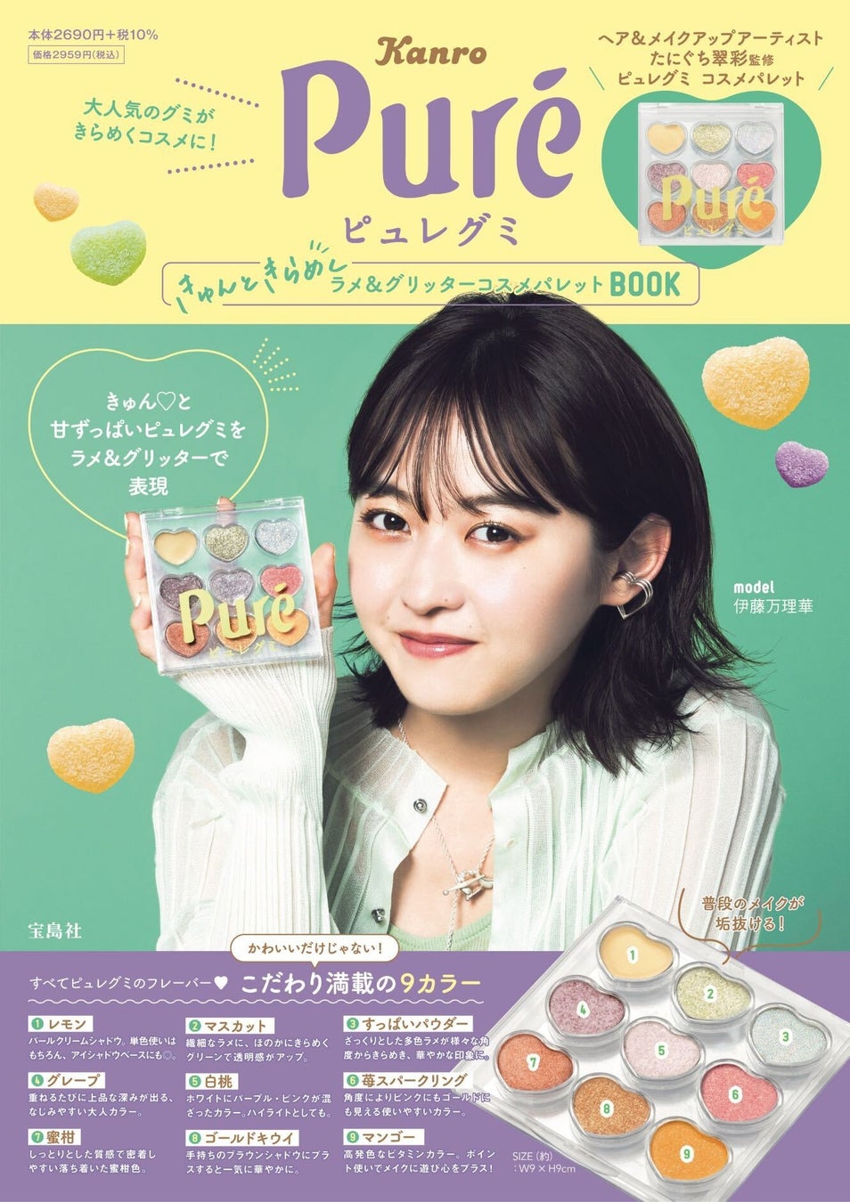 表紙を飾るのは俳優の伊藤万理華(いとう・まりか)さん。コスメパレットを使った3つのメイクに挑戦していただきました。そのほか「ピュレグミ」のおいしさの秘密や誕生秘話、商品ラインナップ紹介などファンにはたまらない情報が盛りだくさん。「ピュレグミ」をもっと好きになる一冊です。