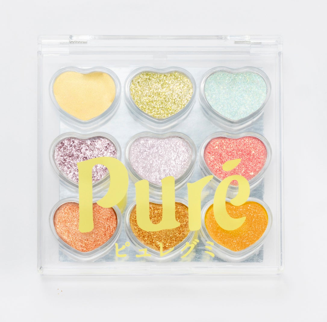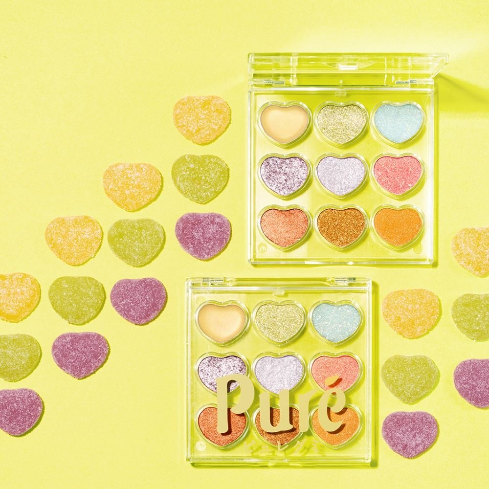 特別アイテムは、「ピュレグミ」のきらめくグミ粒を表現したラメ&グリッターコスメパレットです。キュートな見た目はもちろん、ヘア&メイクアップアーティスト・たにぐち翠彩(たにぐち・みどり)さん監修の使いやすさ抜群のカラーもポイント 。 肌なじみのいい発色で、このパレットひとつでアイメイクが完成します。