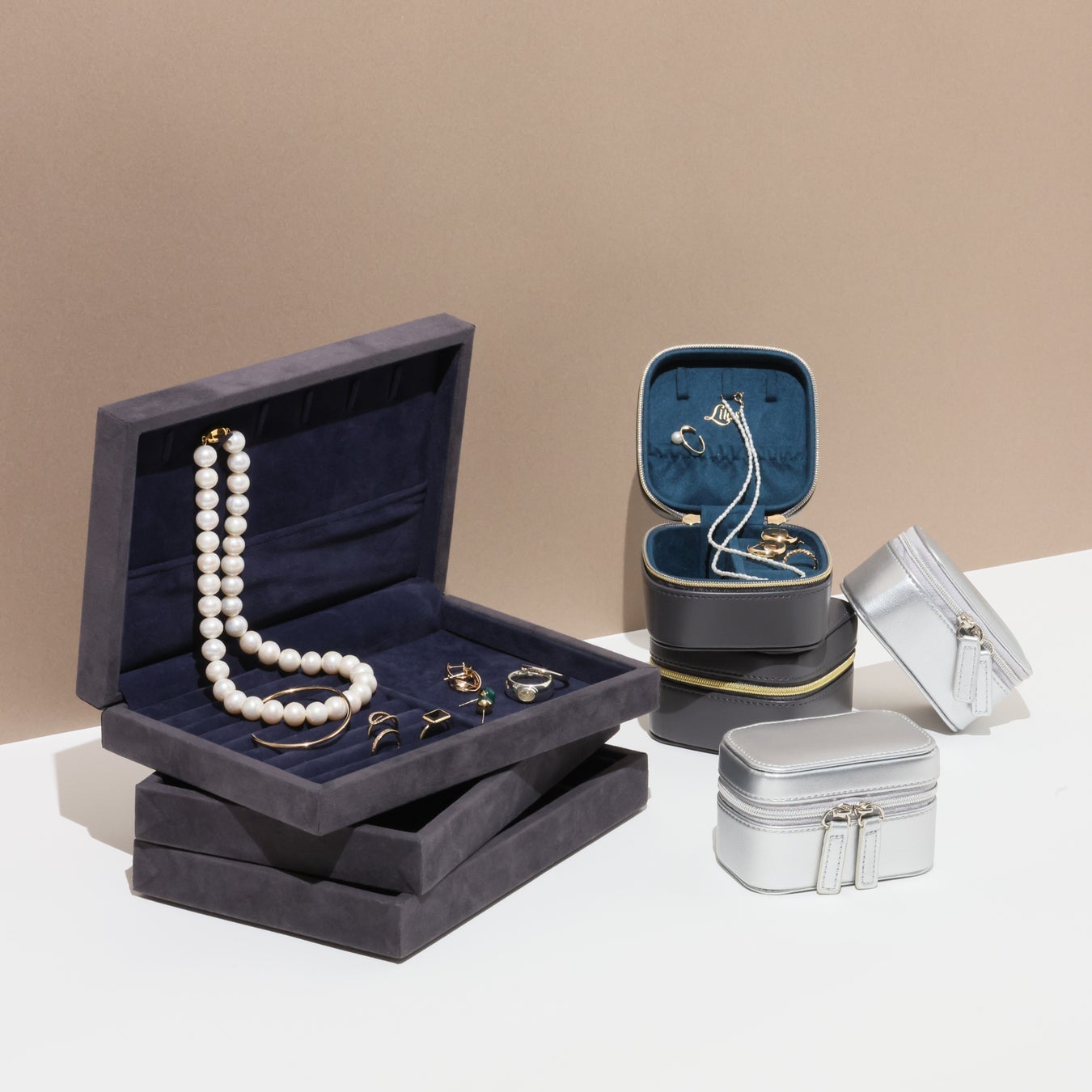 自宅でのジュエリーの保管に最適な蓋つきボックスや蓋つきボックスと重ねて使用することができるトレー2種、持ち運びができるタイプのジュエリーボックスを2種とバリエーションも豊富に展開する。