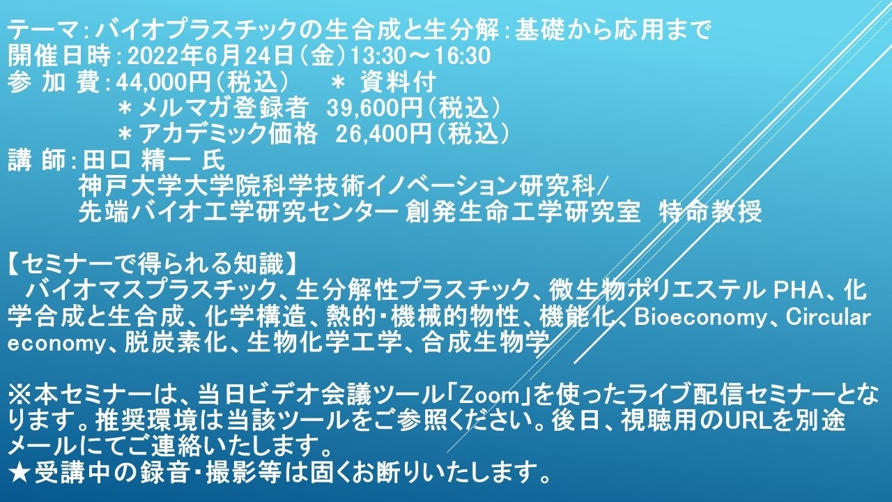 先端技術情報や市場情報を提供している(株)シーエムシー・リサーチ(千代田区神田錦町: https://cmcre.com/ )では、 各種材料・化学品などの市場動向・技術動向のセミナーや書籍発行を行っておりますが、 このたび「バイオプラスチックの生合成と生分解:基礎から応用まで」と題するセミナーを、 講師に田口 精一 氏 神戸大学大学院科学技術イノベーション研究科/先端バイオ工学研究センター 創発生命工学研究室 特命教授)をお迎えし、2022年6月24日(金)13:30より、 ZOOMを利用したライブ配信で開催いたします。 受講料は、 一般:44,000円(税込)、 弊社メルマガ会員:39,600円(税込)、 アカデミック価格は26,400円(税込)となっております(資料付)。